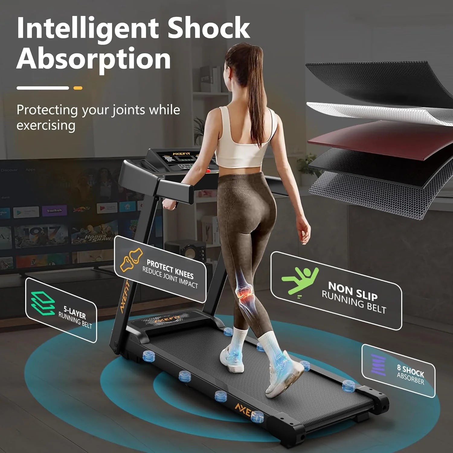 - Anti-Slip & Shock-Absorbing - Our walking pad adopts 5-layer running belt and 10 shock absorbers, greatly reducing impact during exercise, fully protect knees and ankles, and avoid joint injuries. And the diamond pattern design of the running belt also greatly improves the anti-slip and wear resistance of the treadmill and increases the service life of the machine.