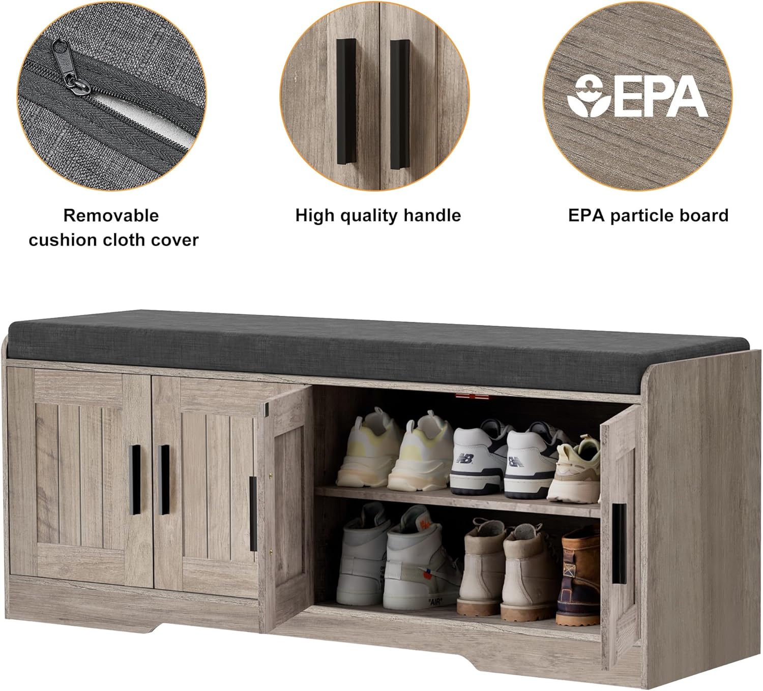 - Stable & Long-lasting: Made of EPA-Certified board, the product is built to last and with a static load of up to 300 lbs. The zipper design of cushion can help you remove and clean cover easily. What are you hesitating about? Now preparing a shoe bench for your home