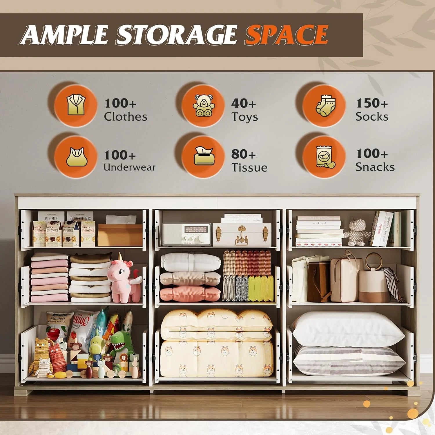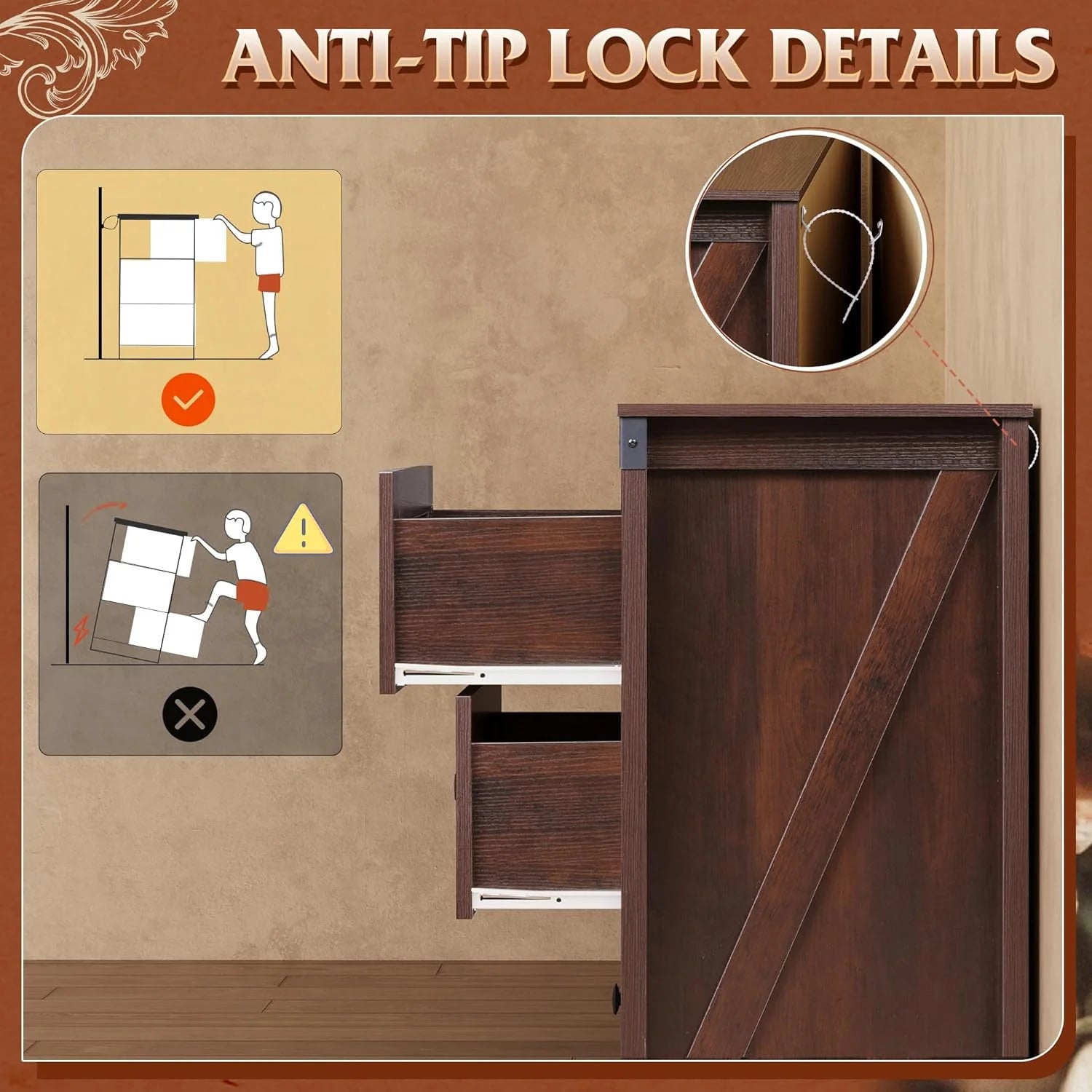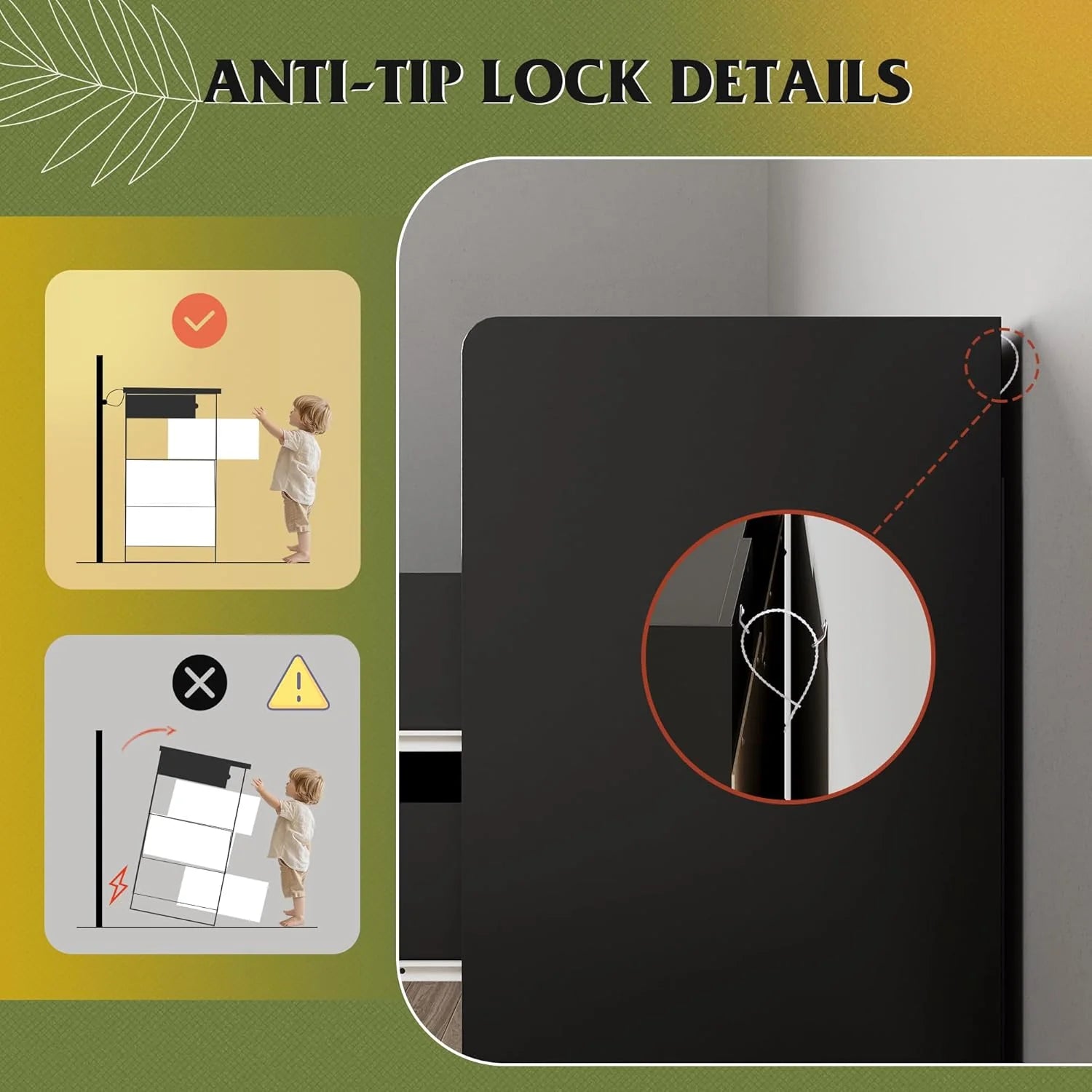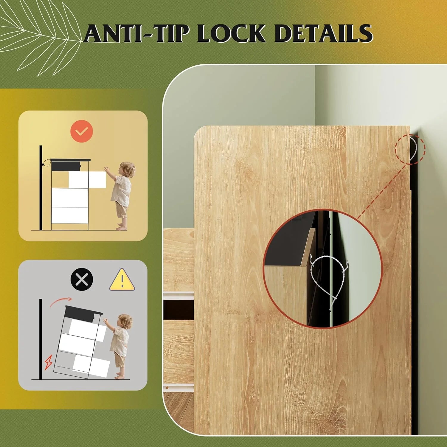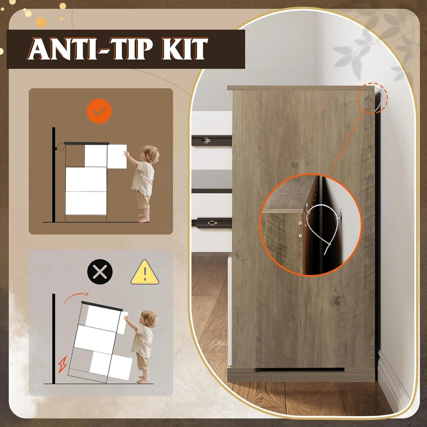 - 【✨ Stable Structure Safety Assured】This bedroom dresser is designed with reinforced base at the bottom. The entire cabinet bearing up to 228LBS can still remain stable without tipping. Additional anti-tilt device can easily fix the cabinet to the wall, ensuring the safety of you, your family and pets, and enjoying a convenient life!