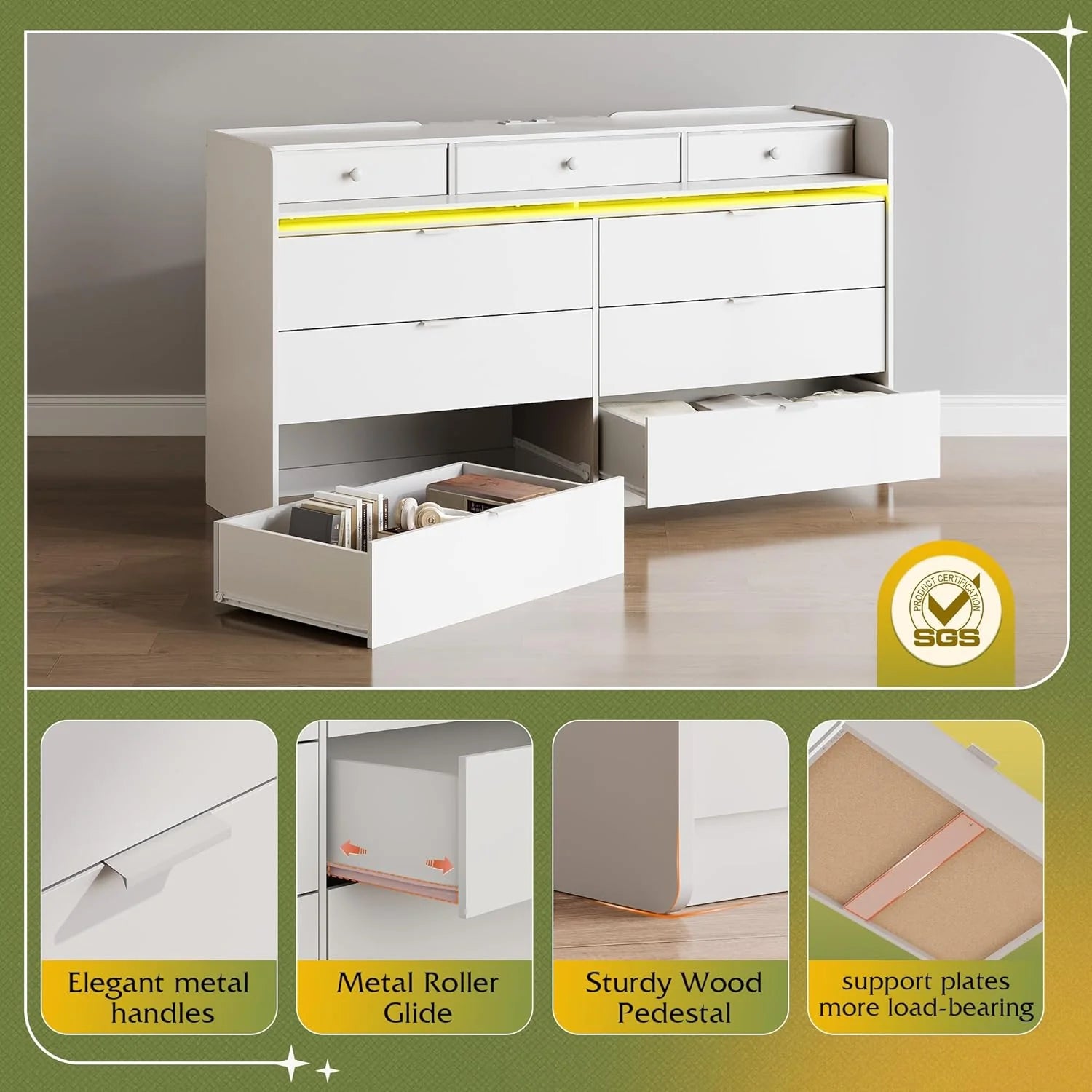 - 【✨ Durable Quality Material】The dresser is made of high quality artificial wood, scratch resistant, easy to clean, strong load-bearing capacity, 3 small drawers above the shelf are composed of three layers of high-quality fiberboard and breathable non-woven fabric. The material process and safety are strictly tested by EPA&SGS, health and environmental protection, excellent quality, for you and your family to create a peaceful life!