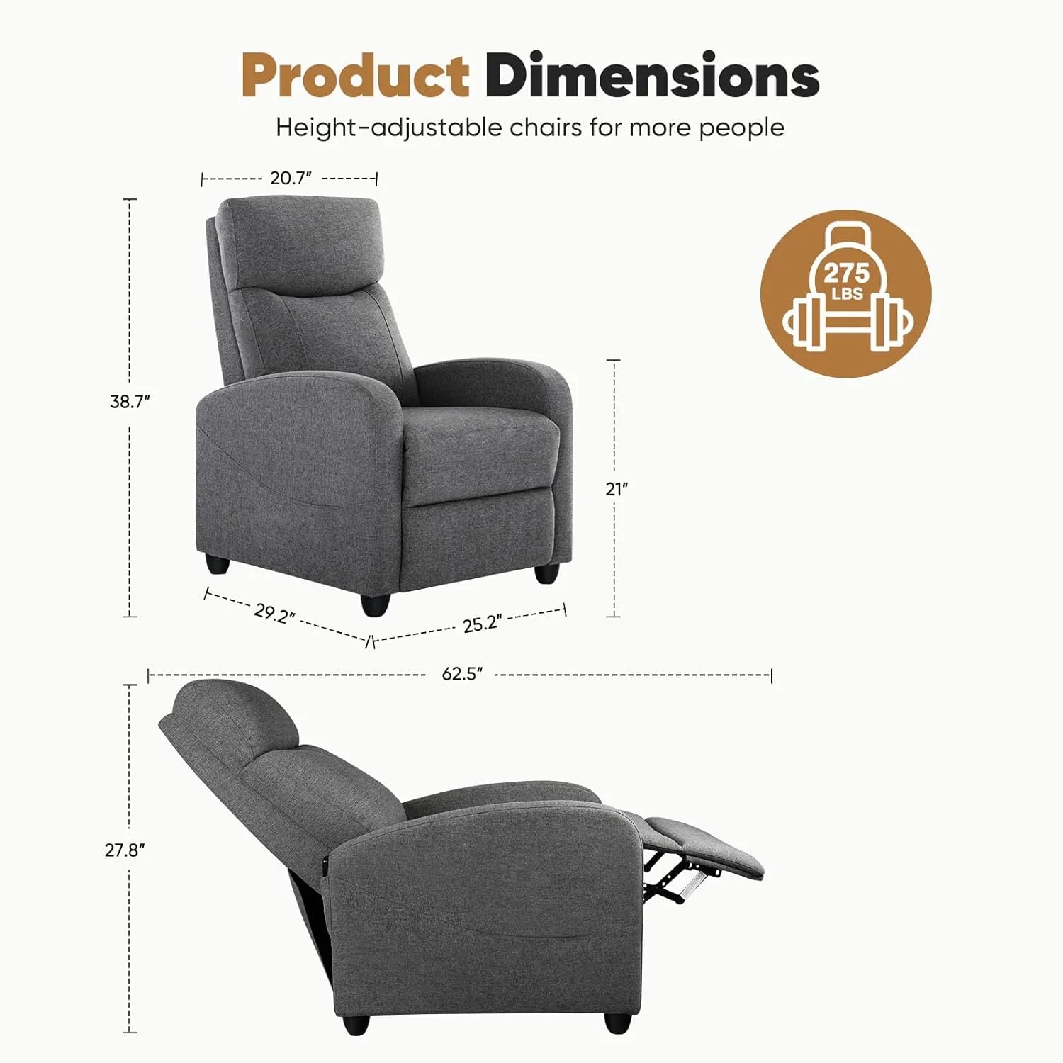 Heavy-Duty steel reinforced backrest and frame offer solid stability as you recline and support up to 265 pounds.