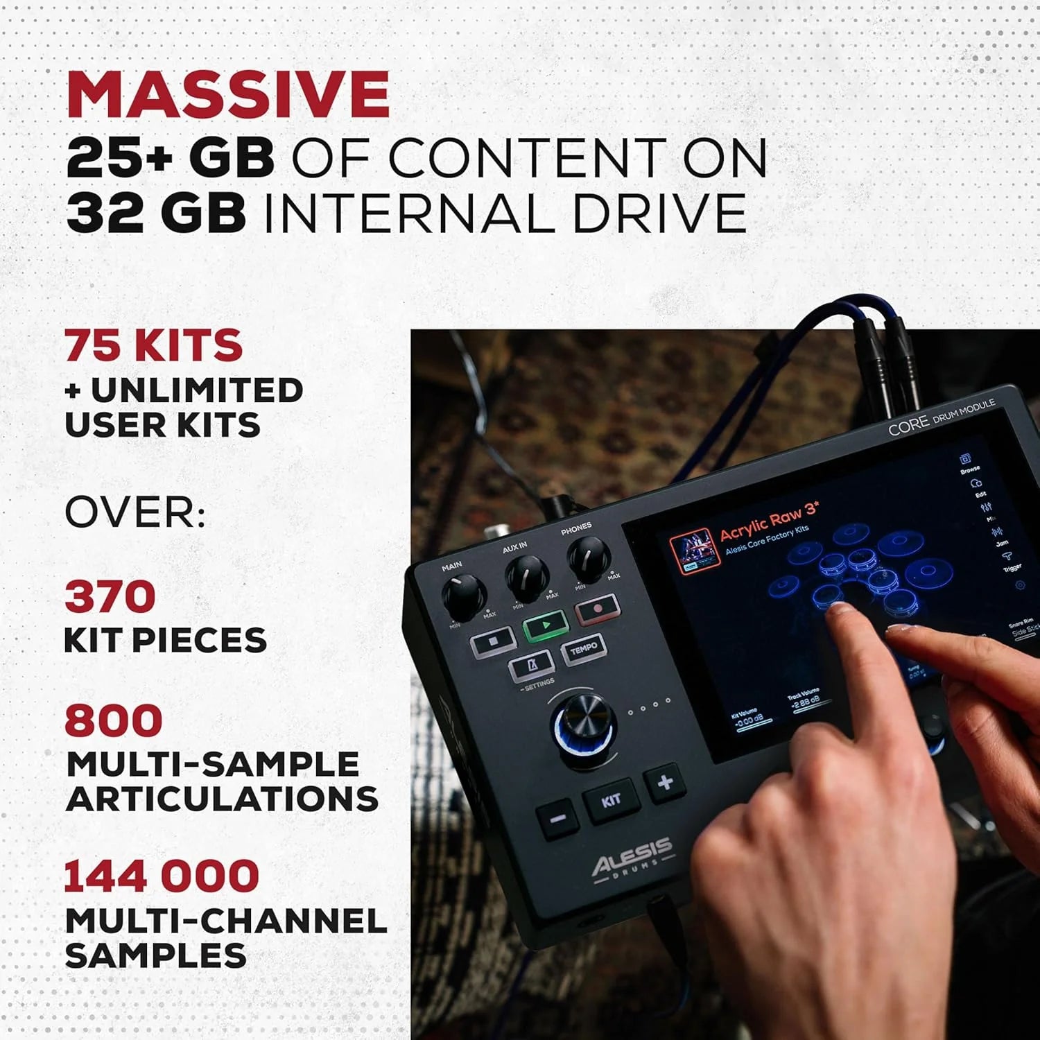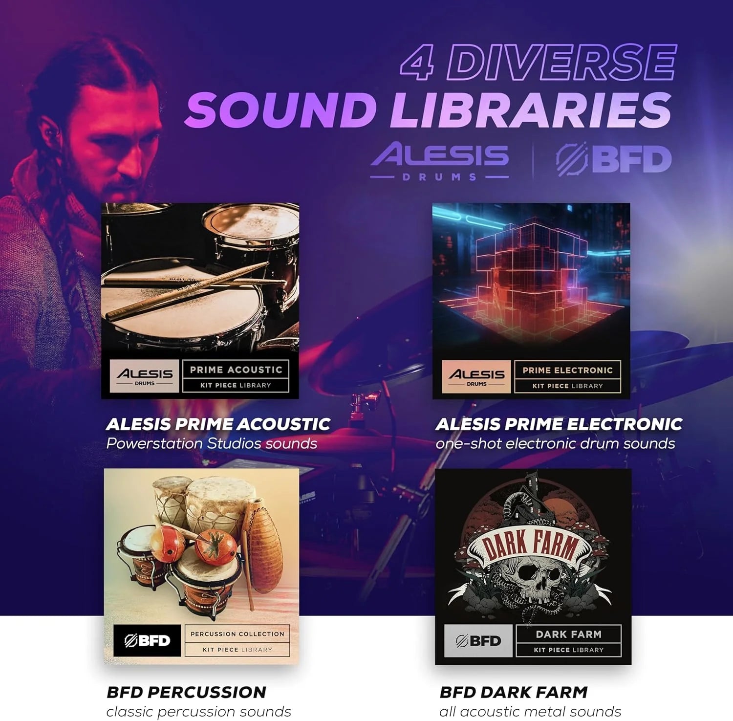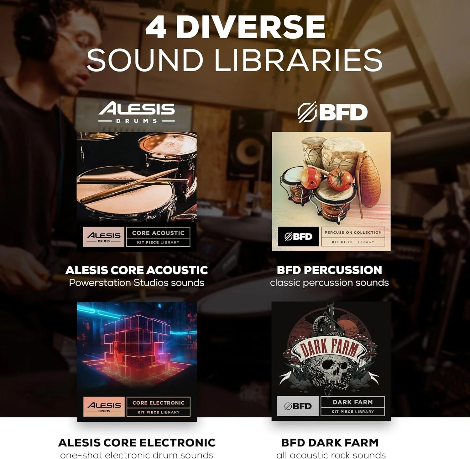 Over 40GB of all new, multi-layered factory content and instruments on 128 GB of internal storage. Featuring automatic crosstalk filtering with presets for all modern Alesis electronic triggers.