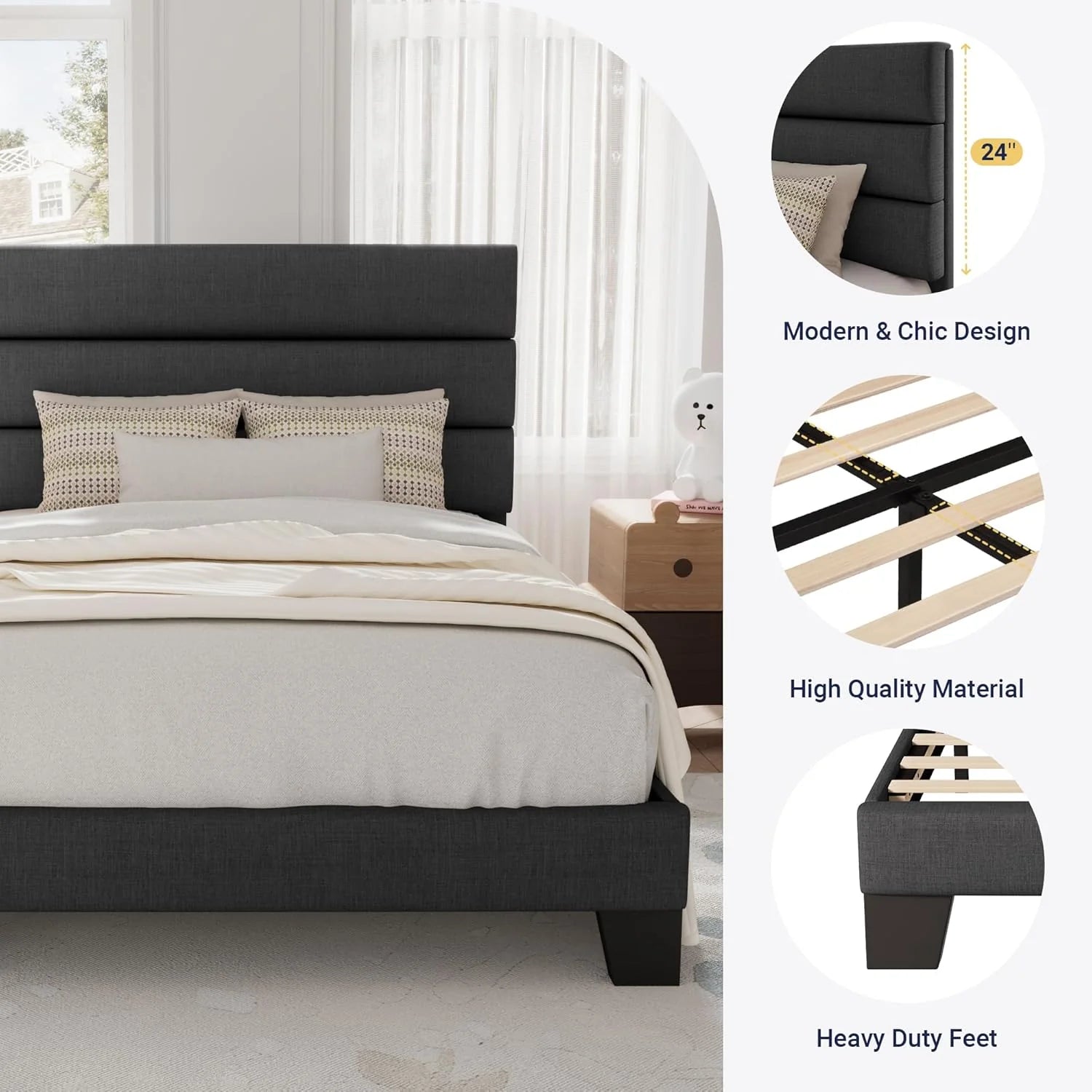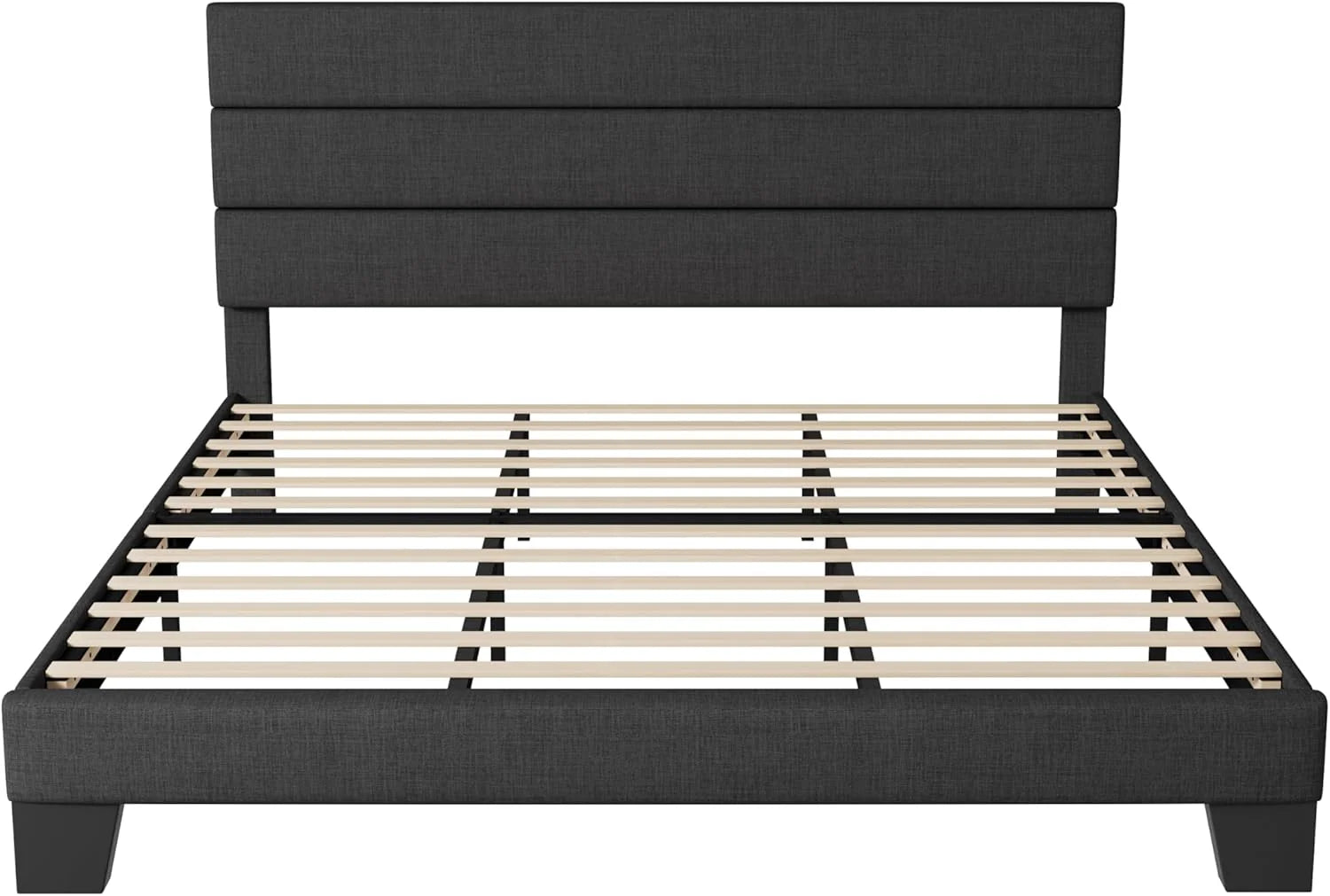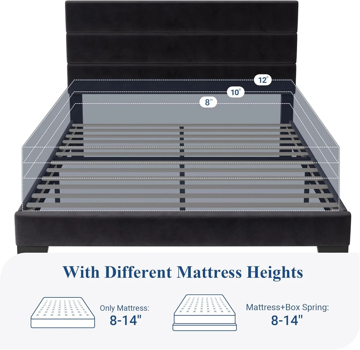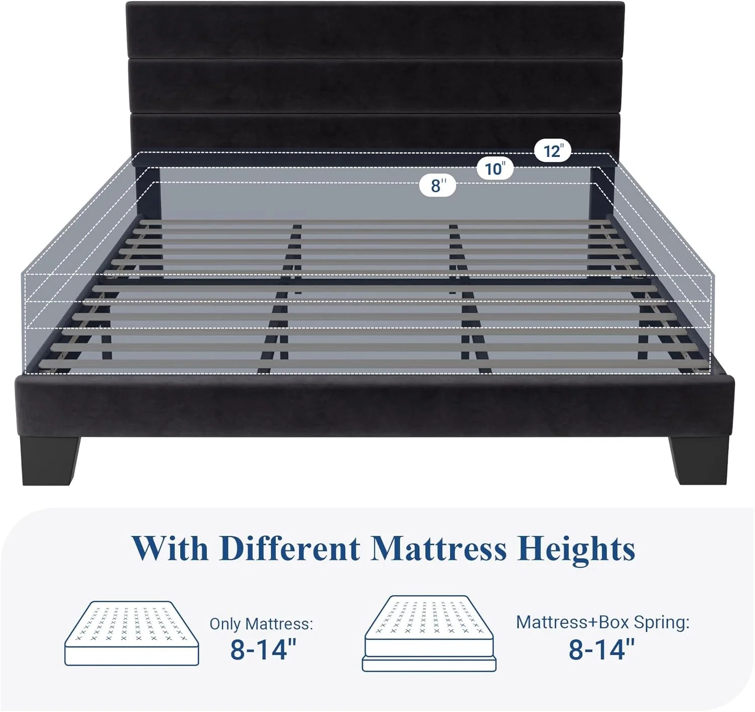 Allewie King size platform bed frame with velvet upholstered headboard and planks