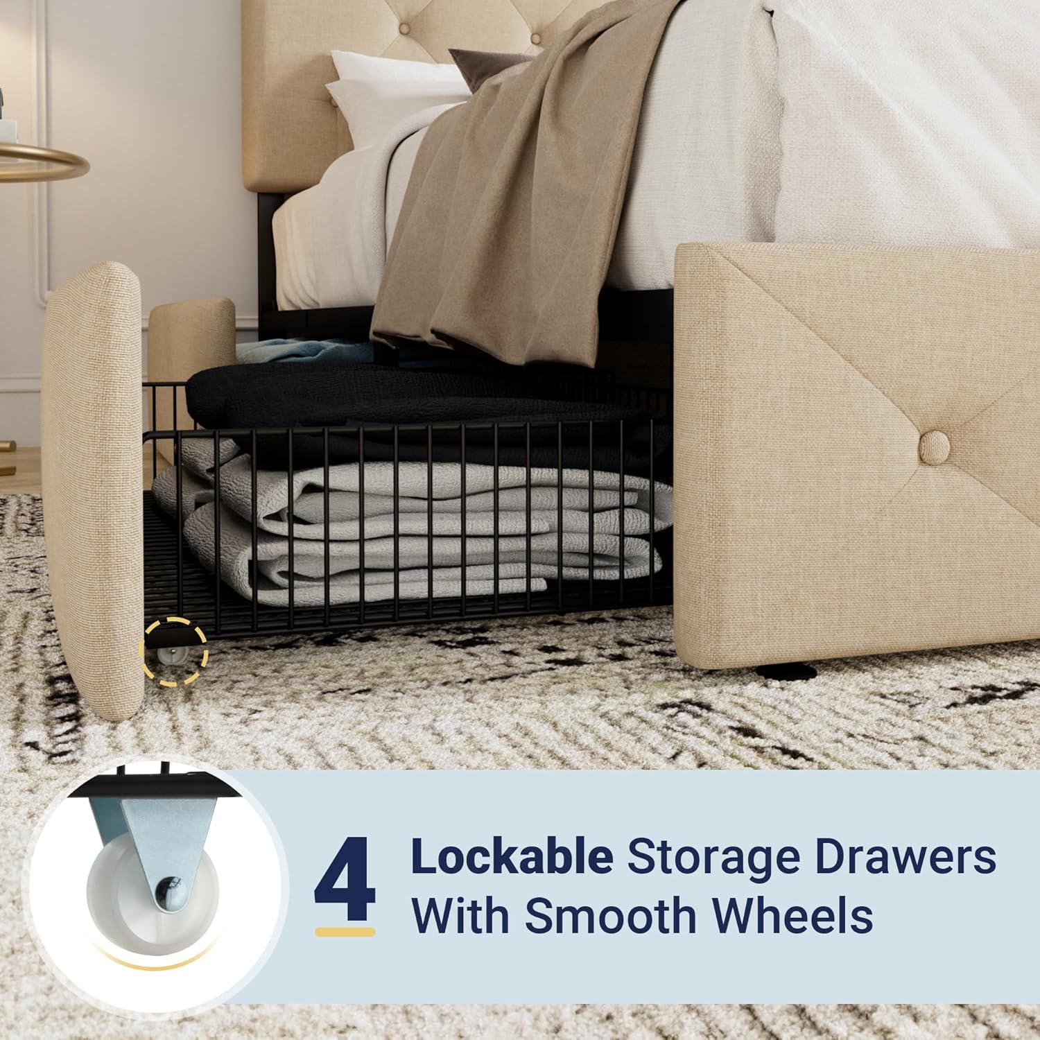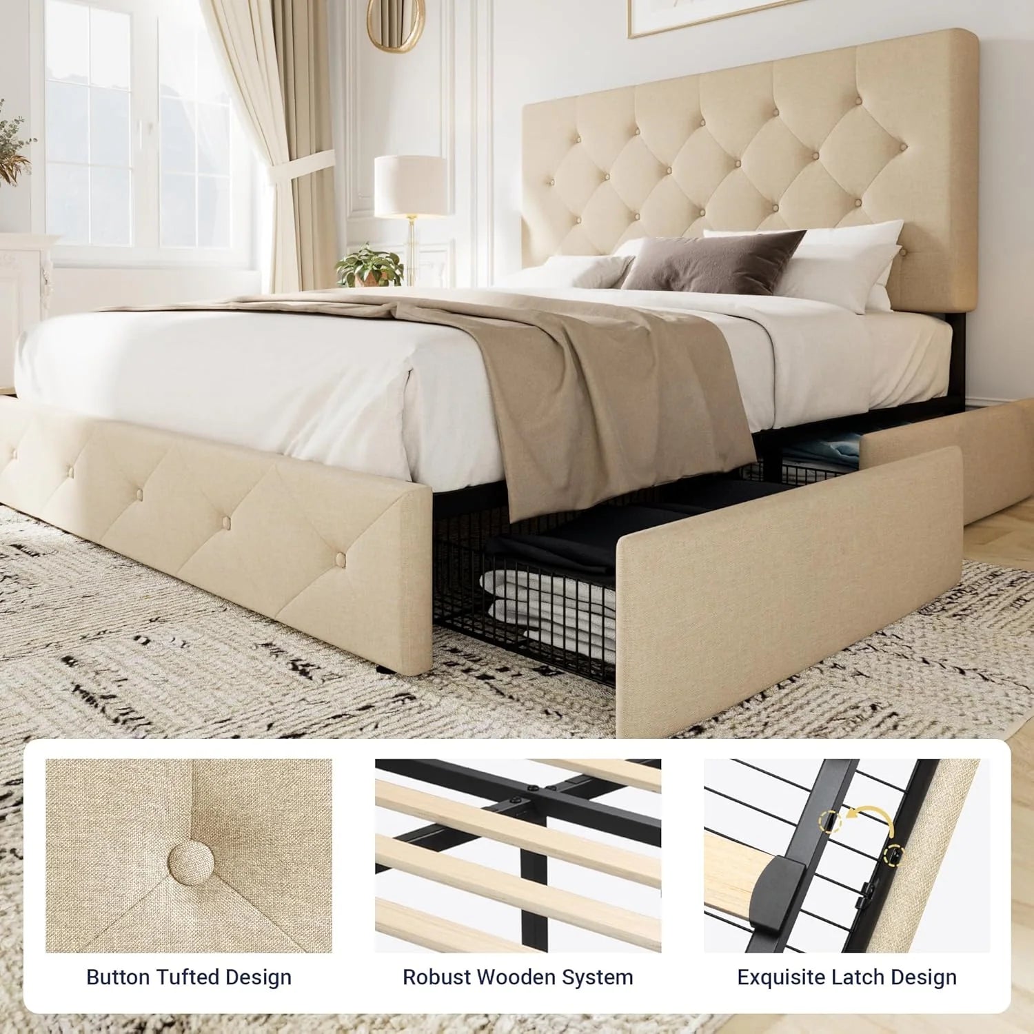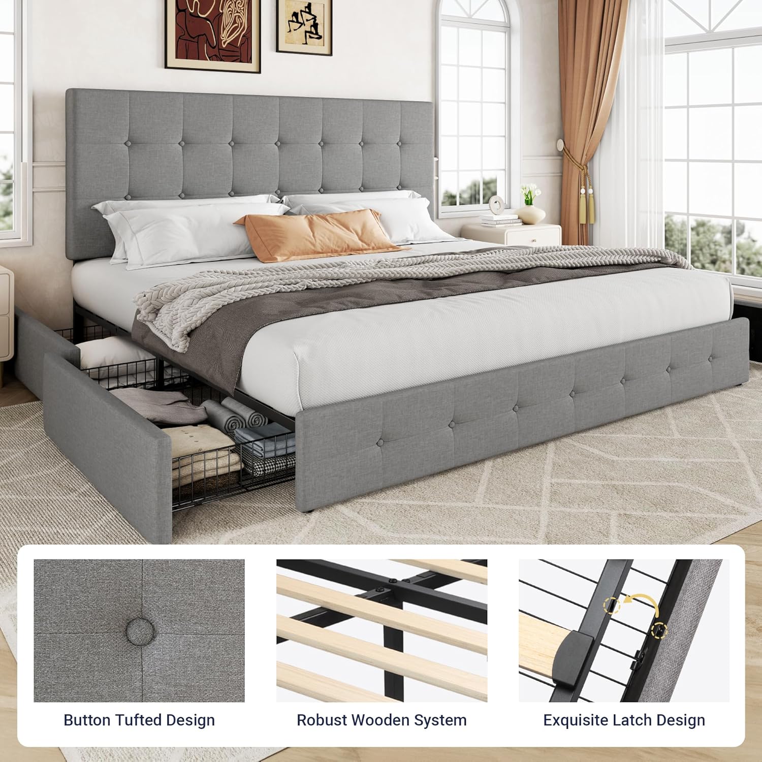 - Space-saving Functionality: With four storage drawers underneath, this queen bed frame offers perfect storage space for bed sheets, accessories, off-season clothing, etc