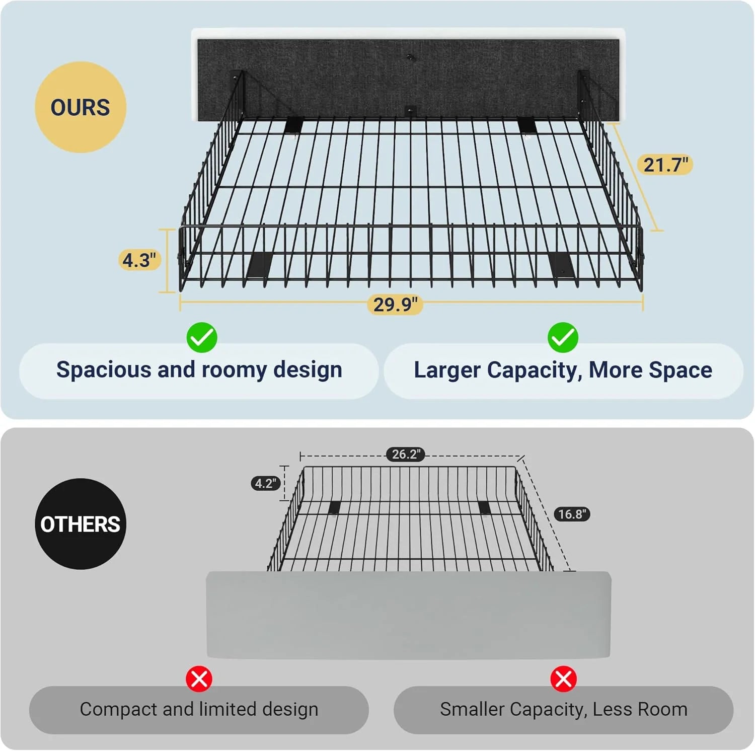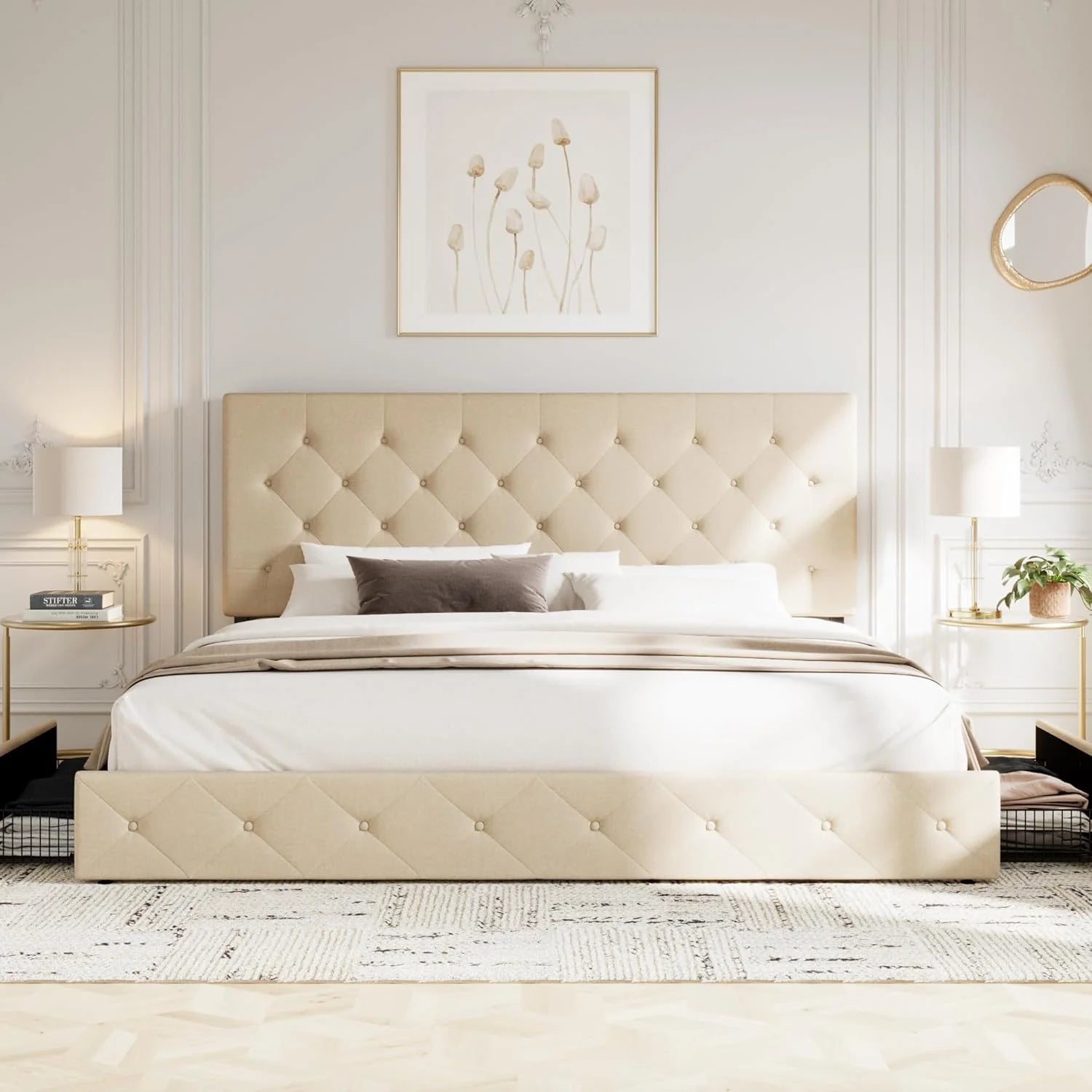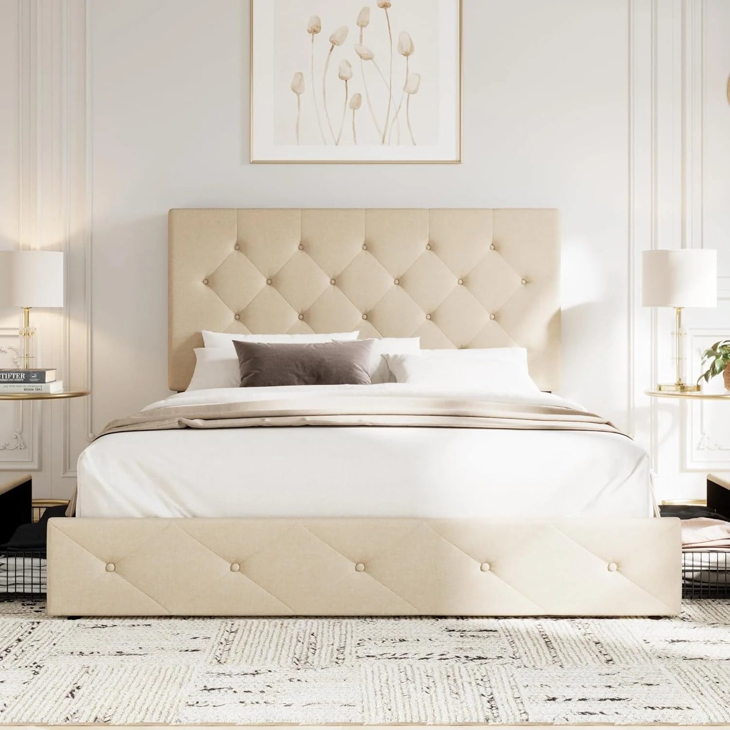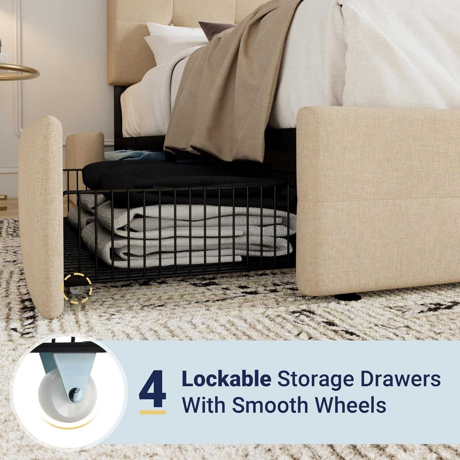 - Space-saving Functionality: With four storage drawers underneath, this queen bed frame offers perfect storage space for bed sheets, accessories, off-season clothing, etc