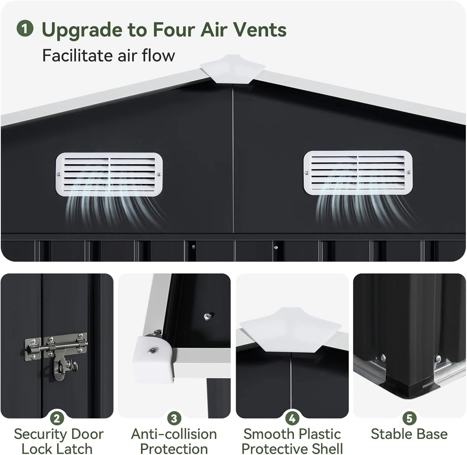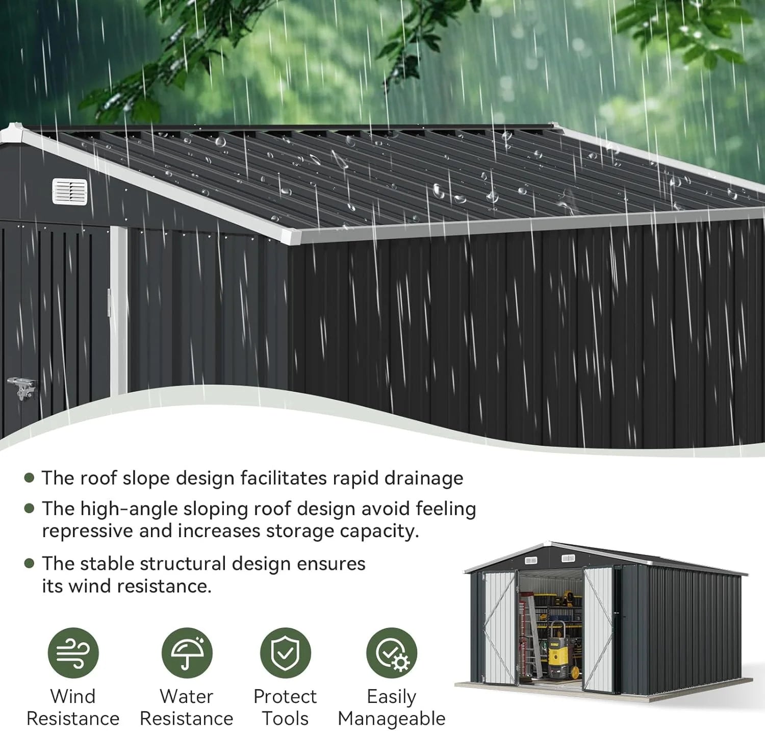 - Durable Large Shed: Galvanized steel, waterproof, withstands harsh weather for long life. Thick metal roof & walls ensure that it will not deform for a long time use. All structures have undergone rigorous structural engineering design, even in heavy snow and wind weather, it can be leisurely