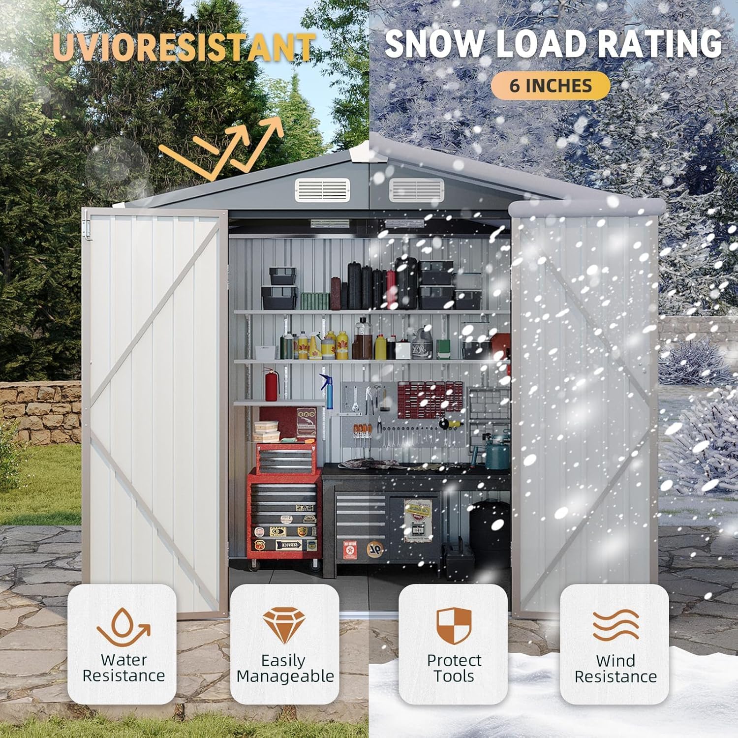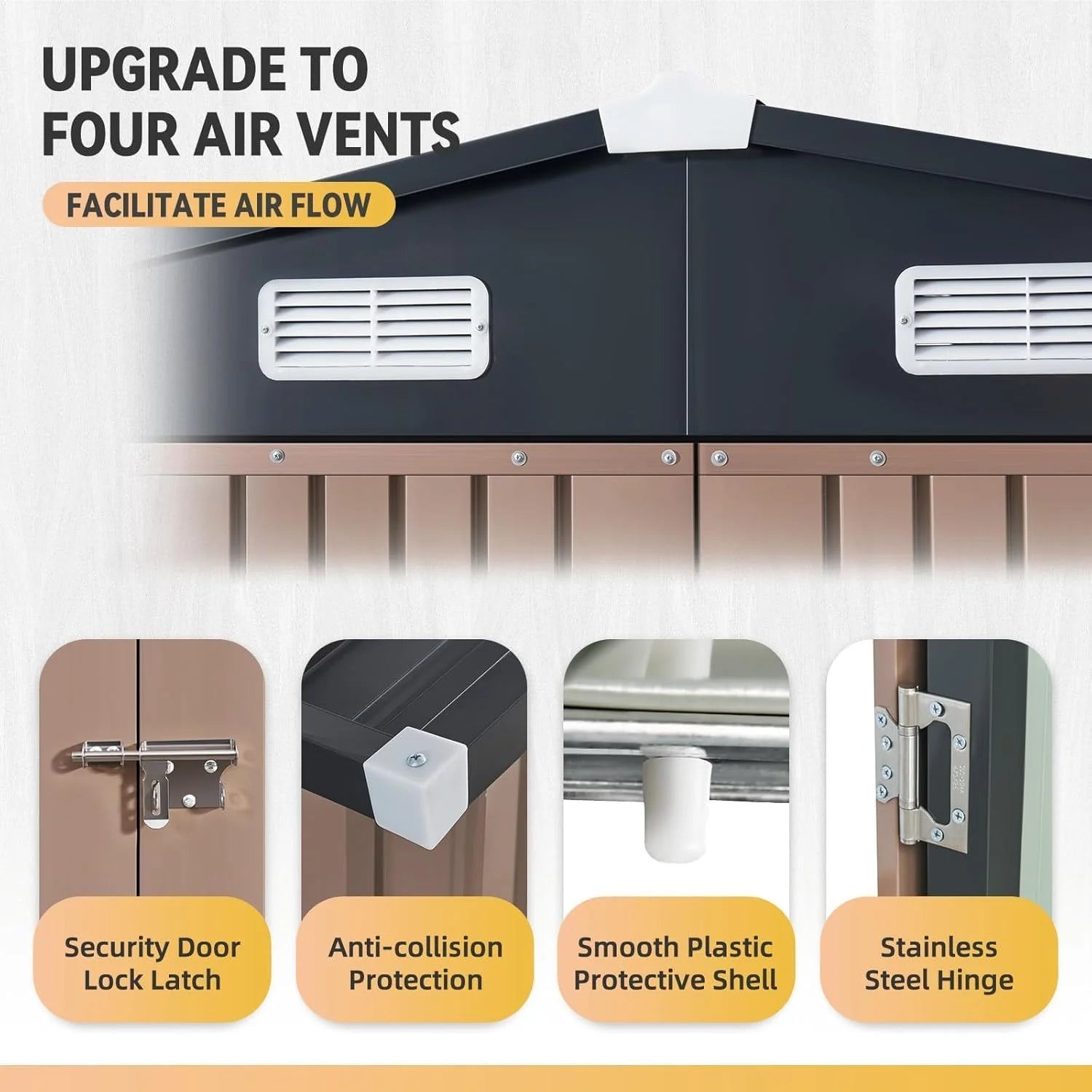 - Dual-Door Accessibility & Smart Ventilation Design: Features double front doors for effortless storage of bulky items like bicycles or lawn mowers. The integrated top ventilation vents regulate airflow to prevent condensation, keeping tools rust-free. Stainless steel latch locks and reinforced hinges provide security against theft and animal intrusion