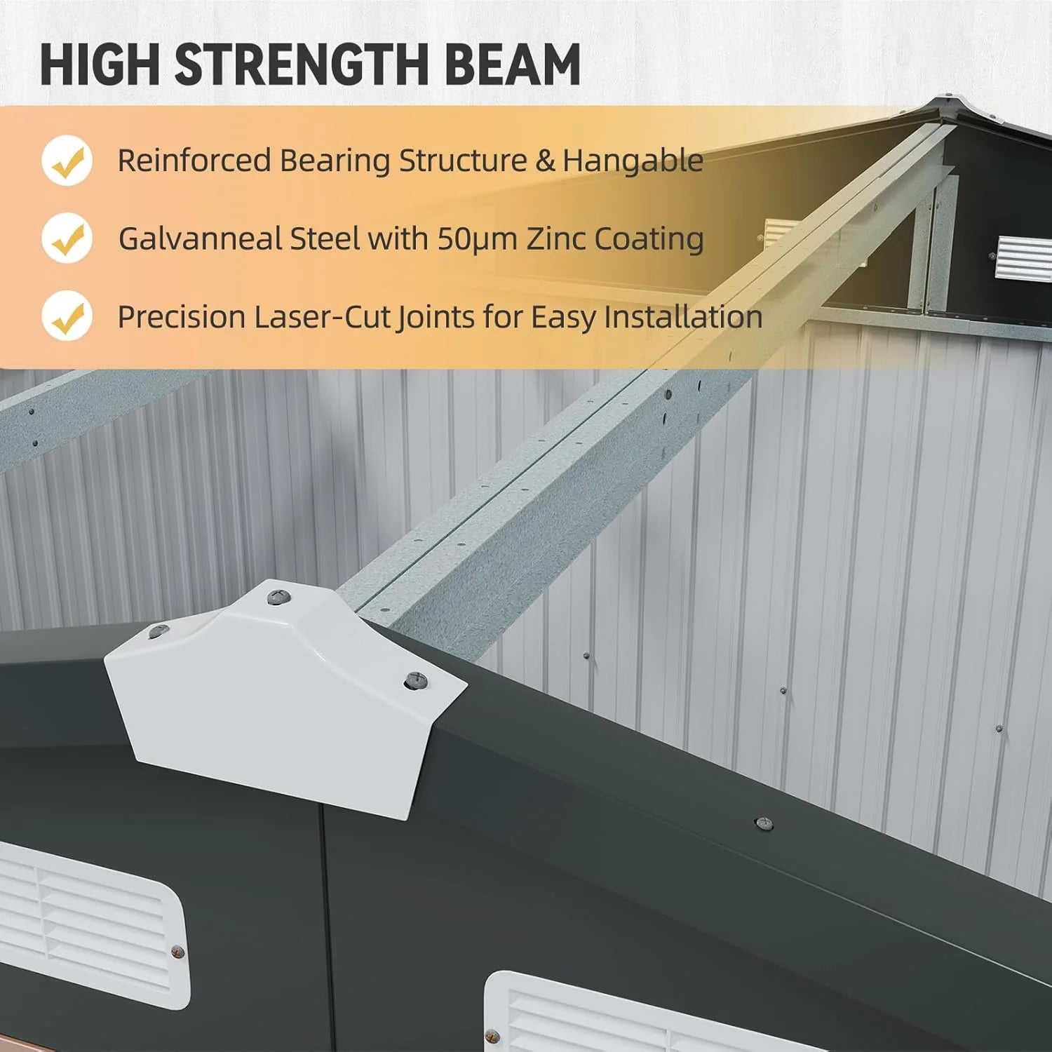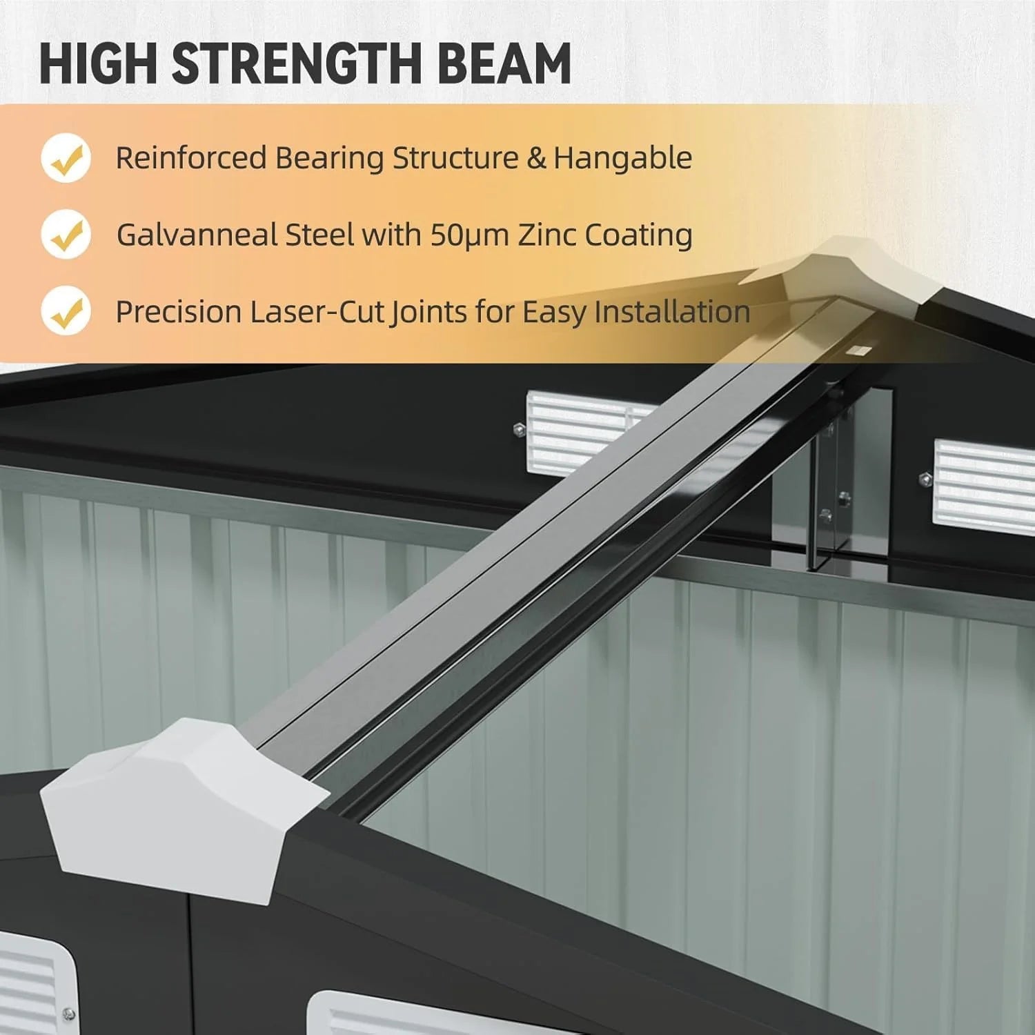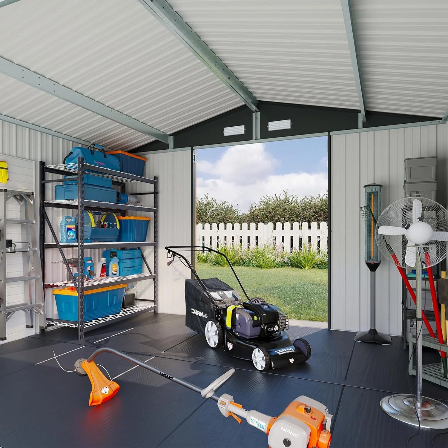- Quality Floor Frame & Galvanized Steel Construction: Crafted with thick galvanized steel panels and reinforced structural engineering, this metal shed delivers exceptional durability. The anti-rust powder-coated surface combined with a 15mm interlocking plastic floor (woodgrain texture) ensures 360° moisture resistance while maintaining floor flatness. In addition, the floor supports a load-bearing capacity of 82 pounds per cubic foot, making it easy to hold heavy machinery