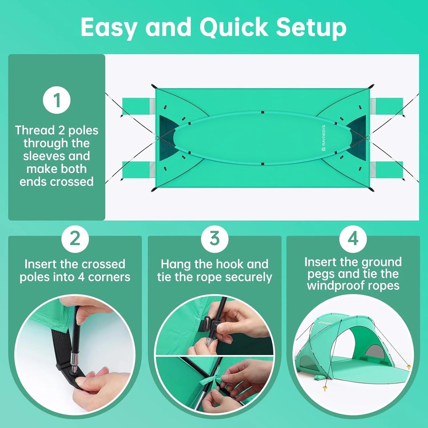 - Easy Setup & Takedown: Without much time and effort, our beach tent sun shelter can be installed and disassembled in minutes. When folded, the beach shade tent is compact and can be put into a storage bag for easy carrying. Whether it's a beach trip, fishing, camping, picnic, or hiking, you can take it with you and start a wonderful outdoor trip.
