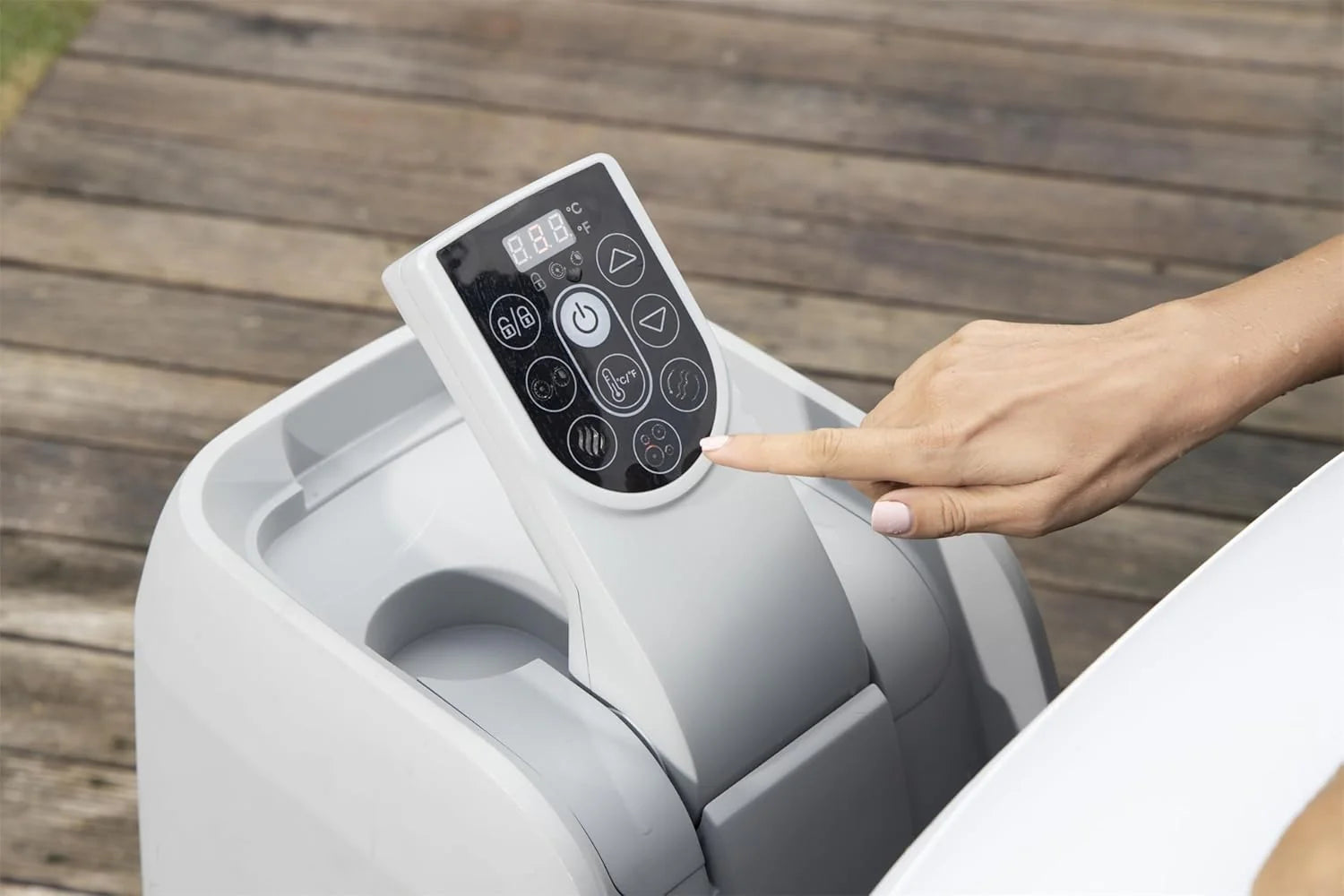 - USER-FRIENDLY DESIGN: The round tub shape is 71" x 26" and fits up to 2-4 persons, making it a great addition to your patio or backyard. The included pump inflates, runs filtration and the AirJet system which can be managed from the digital control panel. It also acts as a tray and cup holder.