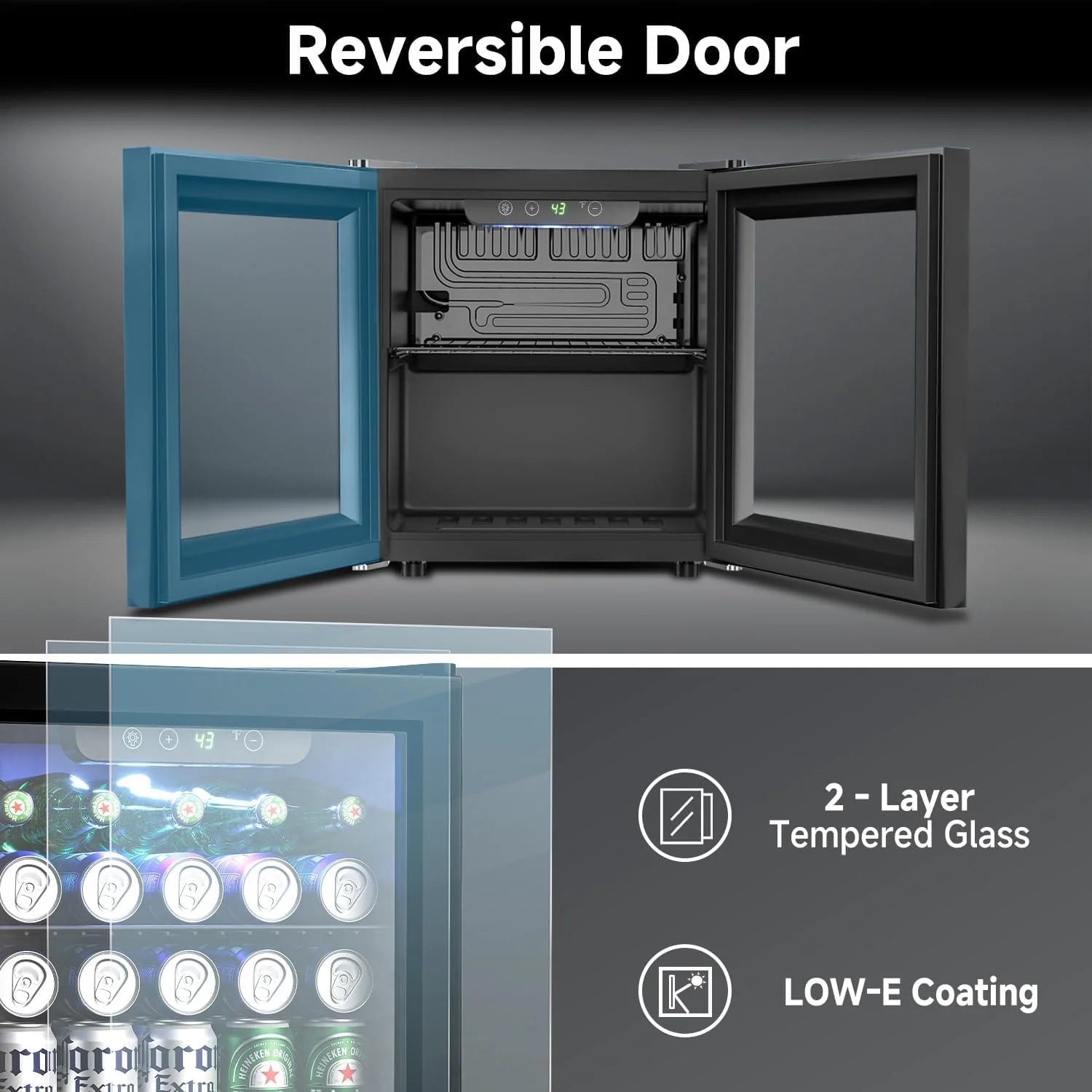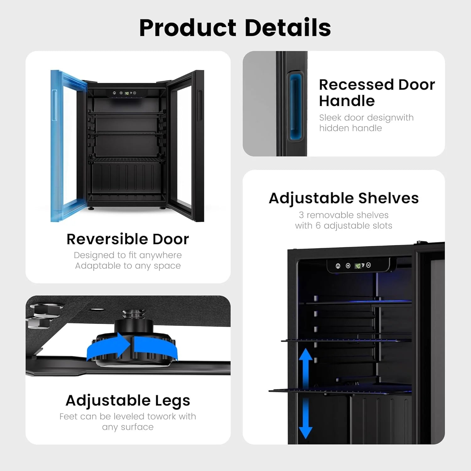 - Premium Design & Aesthetics - The double-layer glass door with LOW-E coating not only enhances insulation but also elegantly showcases your collection. With a reversible door and adjustable feet, this bar fridge (17.5"W x 18.9"D x 31.5"H) is ideal for under counter or freestanding installation. Additionally, the soft blue LED lighting creates an inviting ambiance, seamlessly integrating into your living area and transforming any corner into a beverage oasis.