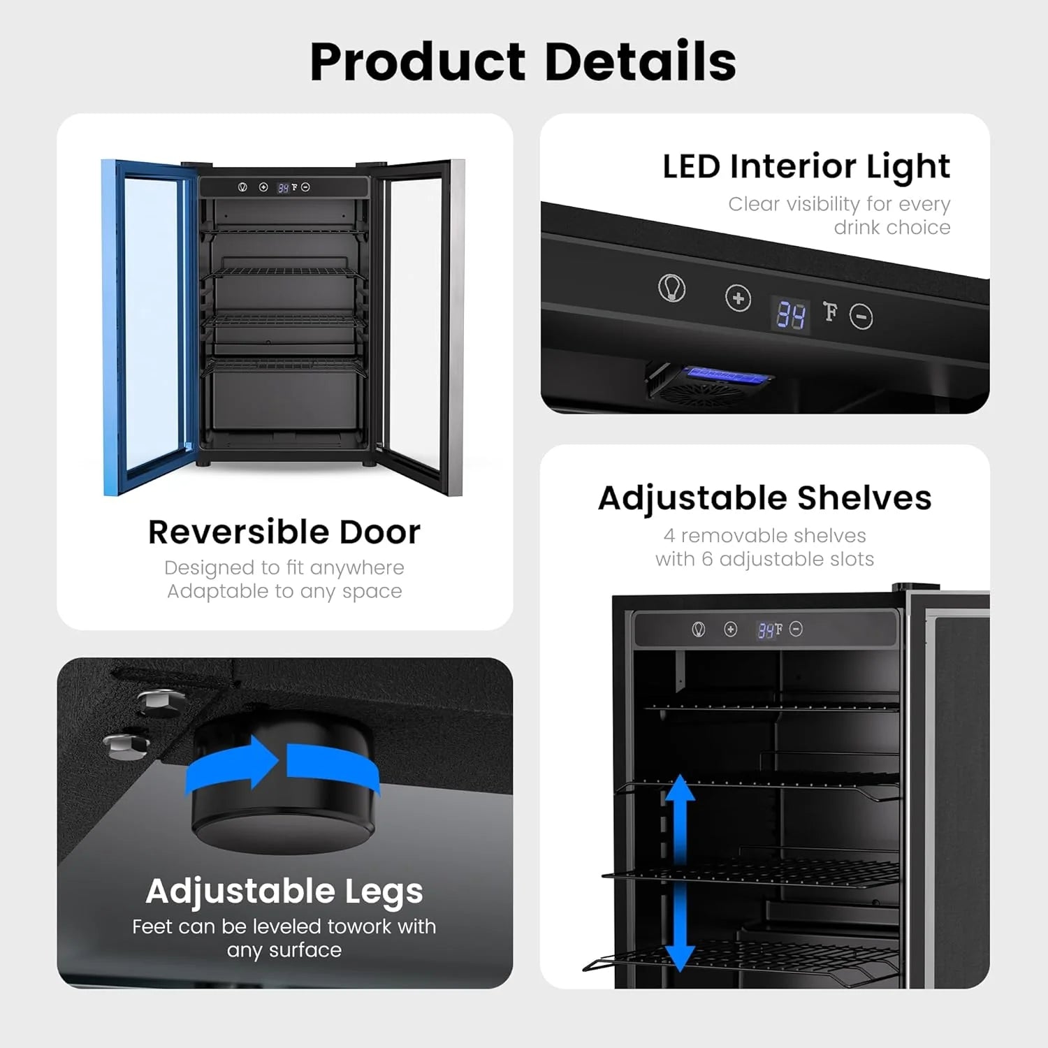 - Optimal Storage Capacity - 3.2 Cu.Ft beverage cooler with 4 adjustable shelves can accommodate up to 126 cans or various wine bottles, allowing flexible storage either upright or horizontally. This drink fridge is perfect for keeping your favorite soda, beer, or wine chilled and neatly organized. Whether it's for your kitchen, home bar, RV, dorm room, or garages, enjoy easy access to a variety of beverages always kept at the ideal temperature.