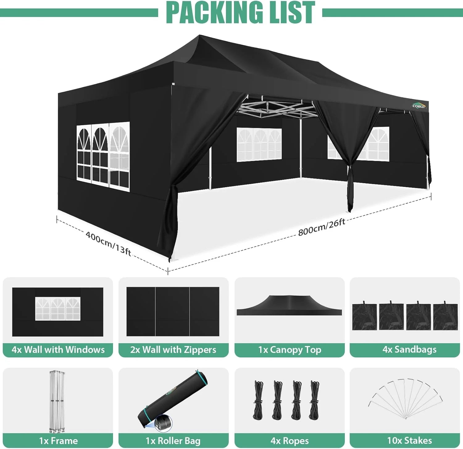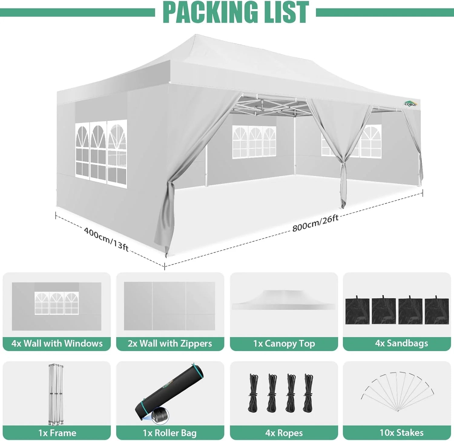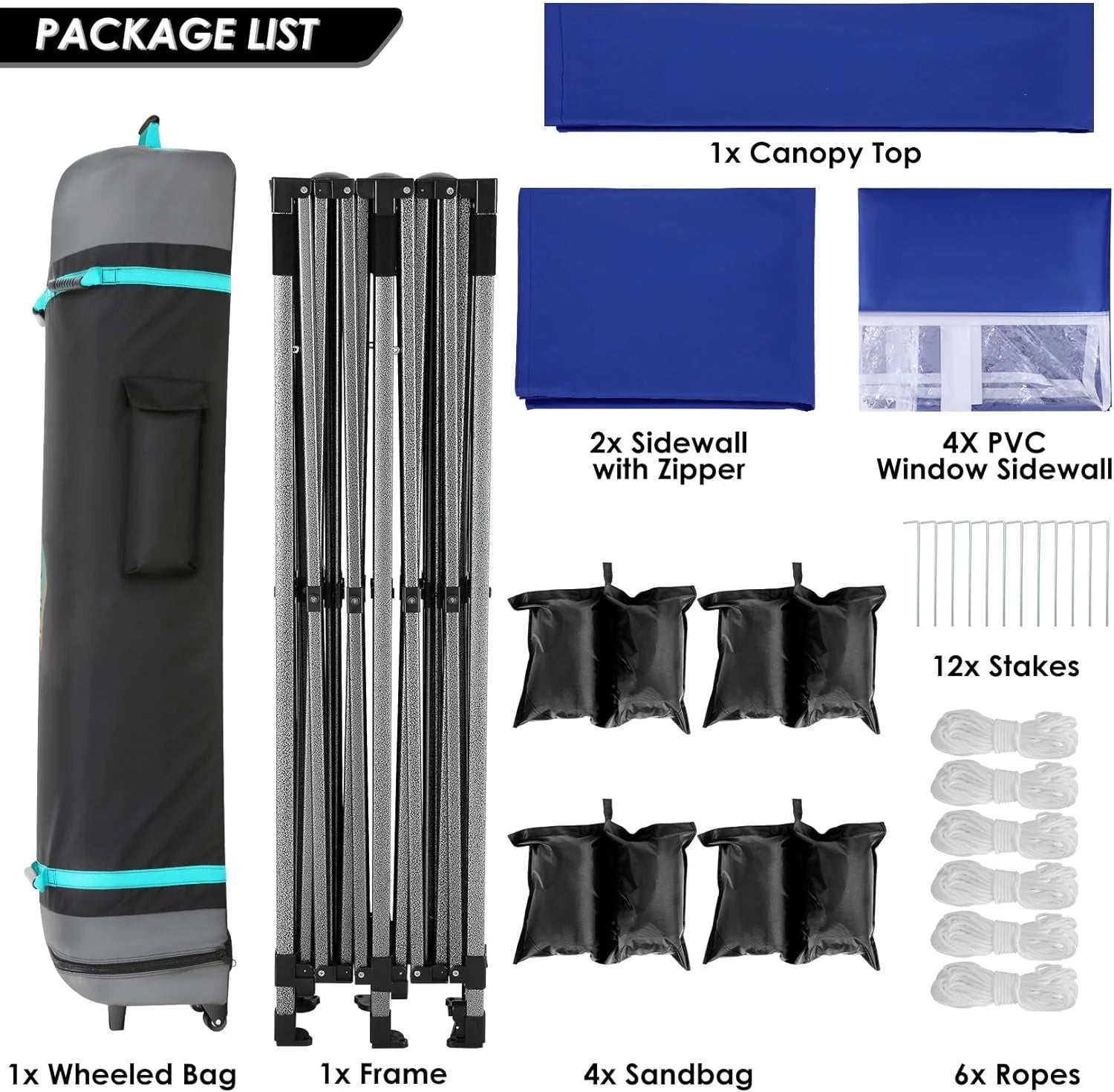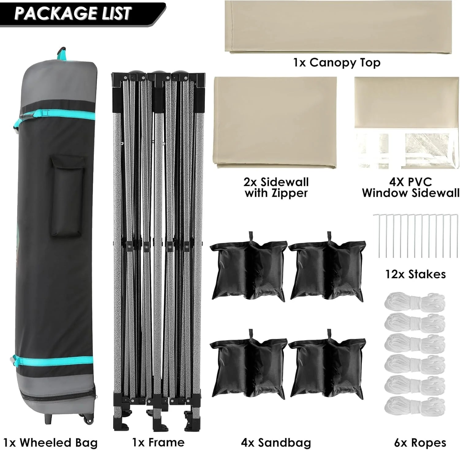 - 【Packing List】1x 10x20 Commercial Pop-up Canopy Frame, 1x 10x20 Canopy Top Cover, 6x PU coated Panels (4x SideWalls with Window and 2x SideWalls with Zipper), 4x 420D Oxford cloth PVC coated Sandbags, 12x Ground Pegs, 6x Wind Ropes, 1x Wheeled Bag, 1x Manual. We provide you with the best service, if you have any questions and doubts, please feel free to contact us. Choosing us will be a right decision