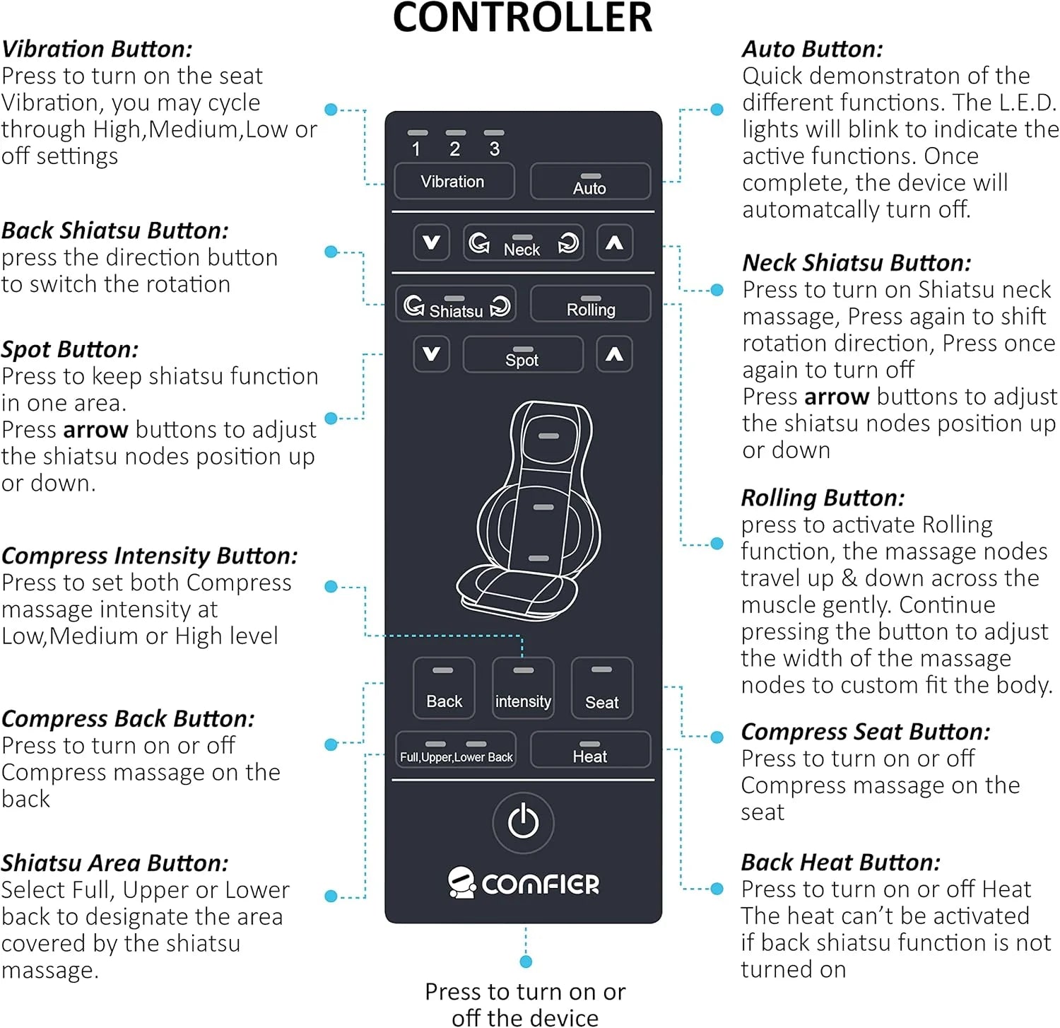 - SHIATSU NECK & FULL BACK MASSAGER-Comfier Seat Massager has 4 Shiatsu nodes for neck and shoulder massage,the shiatsu balls position can be adjusted to meet specific user. The chair massage cushion has 4 shiatsu massage nodes that cover the whole back to deliver deep tissue kneading massage for back muscles relaxation.