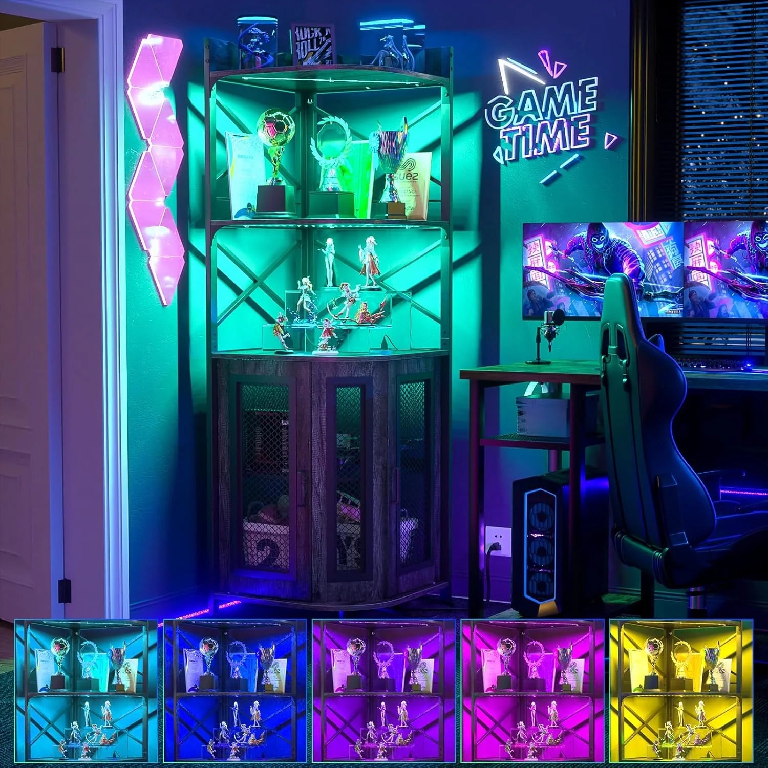 Industrial Corner Wine Cabinet with Charging Station, LED Strip, Glass Holder, Liquor Cabinet for Home