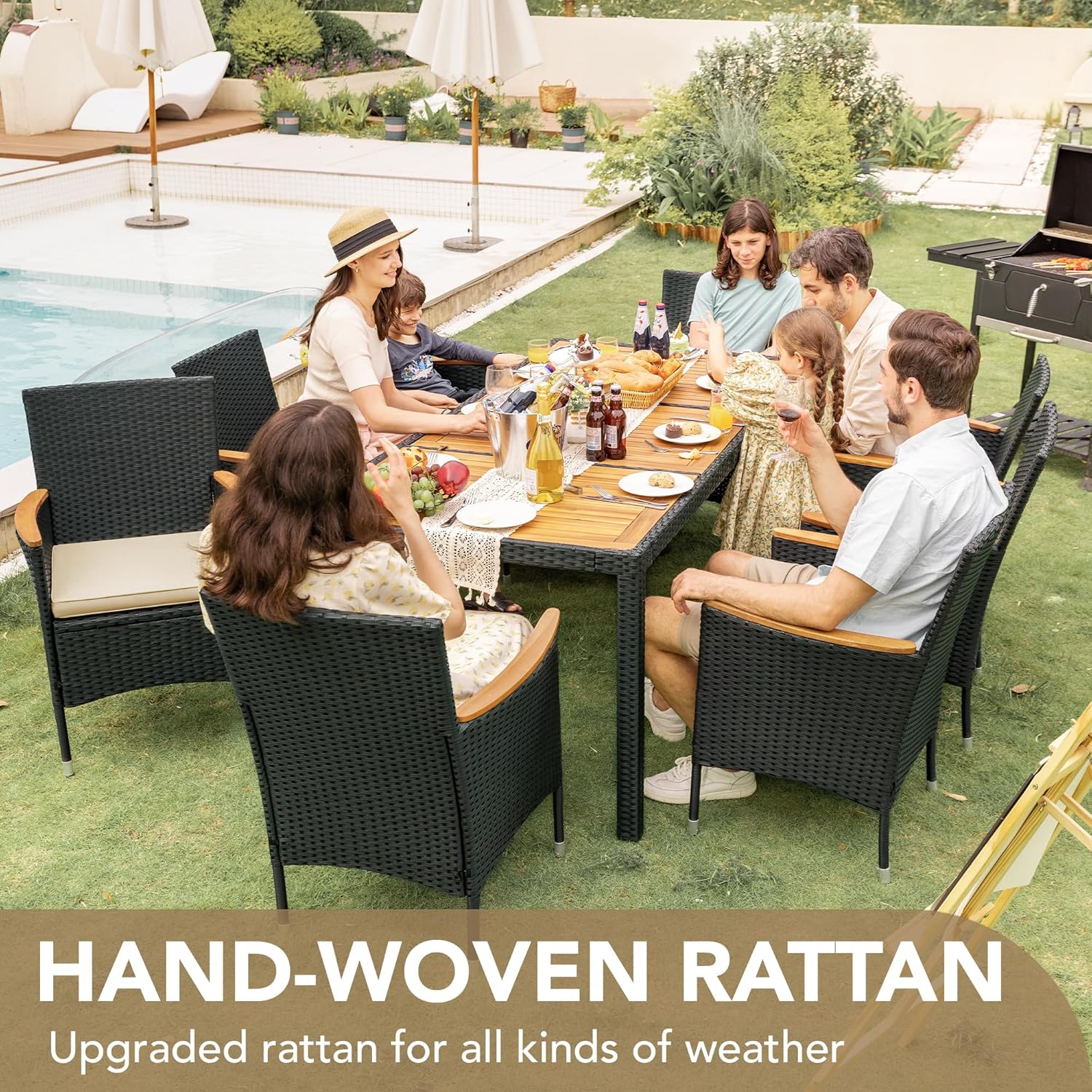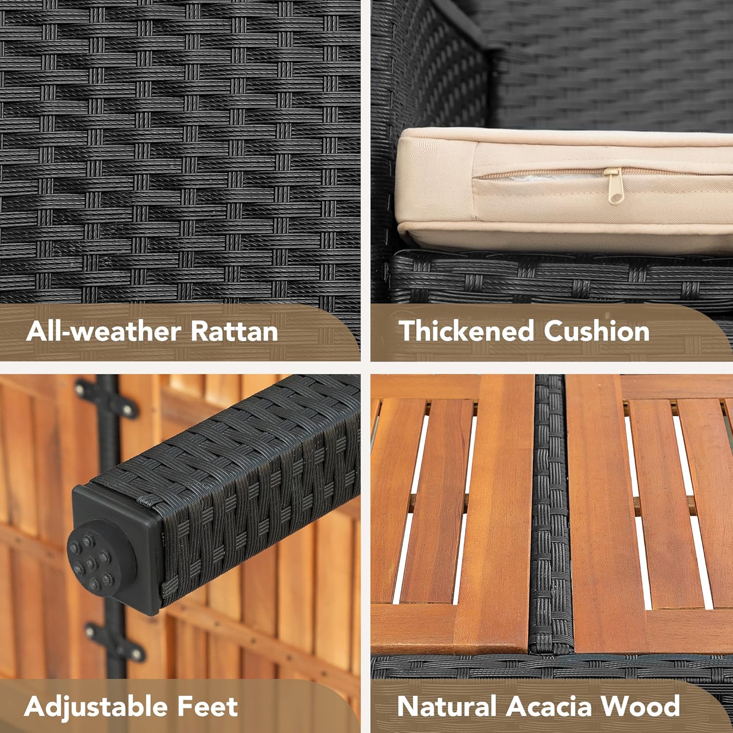Devoko Dining 7 PCS Furniture, Patio Conversation Set with Acacia Wood Table Top, Rattan Outdoor, Black