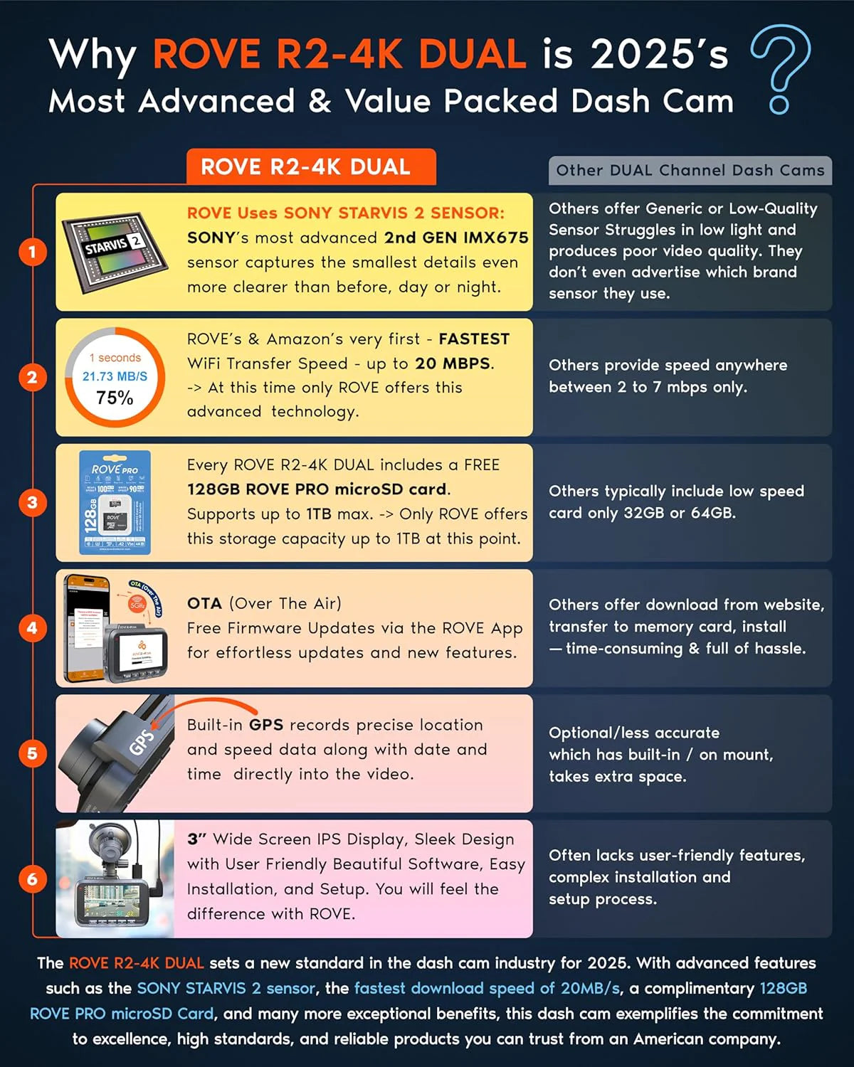 - STARVIS 2 SENSOR/SUPER NIGHT VISION – Equipped with a IMX675 STARVIS 2 Image Sensor for the front camera, this dash cam delivers exceptional image quality with vivid colors and sharp details, even in challenging lighting conditions. Additionally, the front camera's F1.5 aperture and the rear camera's F1.8 aperture allow more light to enter the lens, resulting in brighter and clearer recordings, particularly in low-light environments.