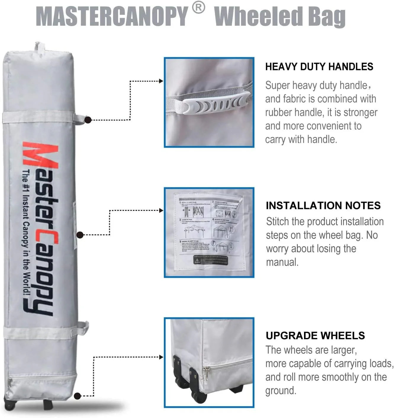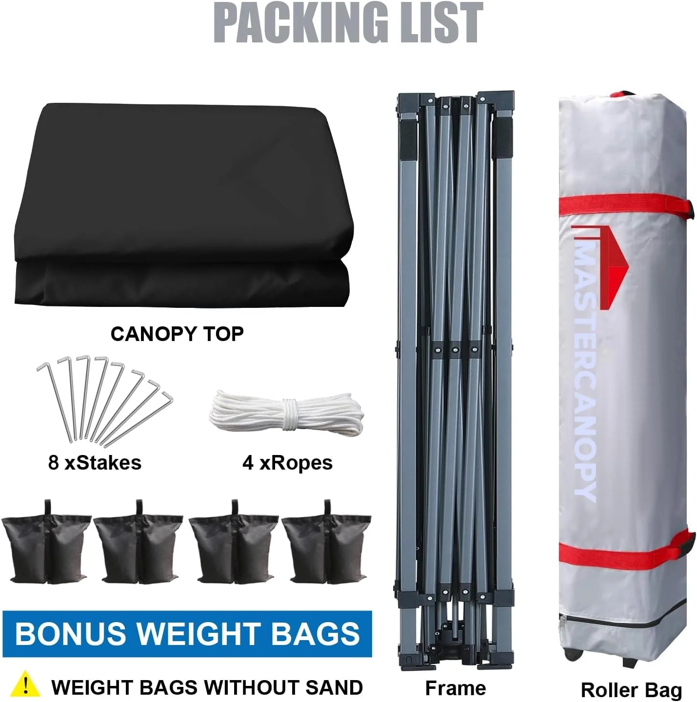 - Upgraded Package: Includes 10x10 Pop up canopy frame + Canopy tent top cover + Roller bag + 4 Weight bags. Wheeled bag is 52x9x9, 300D coated PVC fabric to transport the pop up canopy at ease.