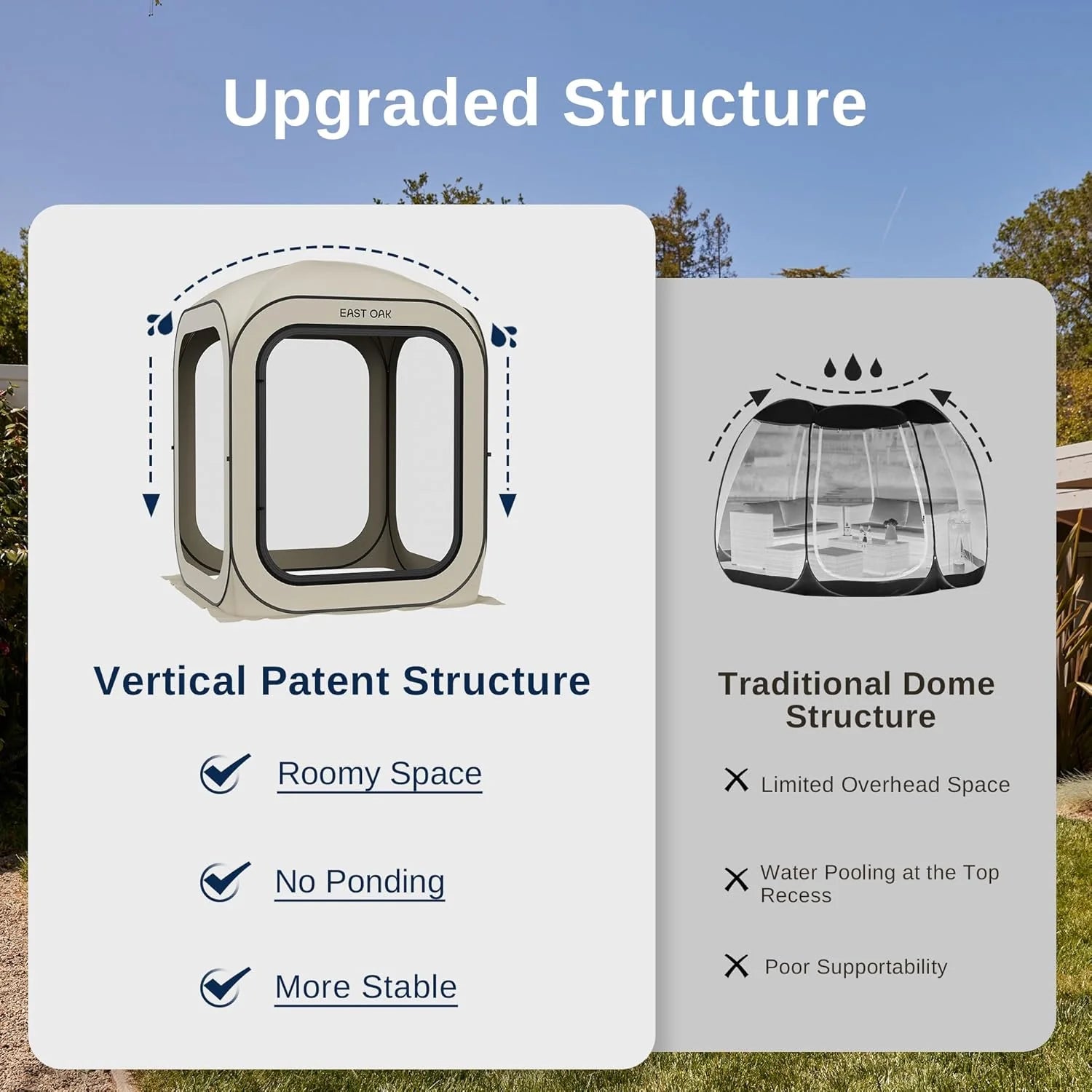 - 𝗥𝗼𝗼𝗺𝘆 𝗦𝗽𝗮𝗰𝗲 & 𝗨𝗽𝗴𝗿𝗮𝗱𝗲𝗱 𝗗𝗲𝘀𝗶𝗴𝗻: This screen house frame is made of durable 300D Oxford fabric and rust-resistant steel structure. The top structure is supported by heavy-duty fiberglass, which prevents water from accumulating and delivers more space. The zipper can be used on both sides, and its connection with the tent is upgraded with doulble stitching, making it less likely to tear. The door curtain can befixed to the side for easy access