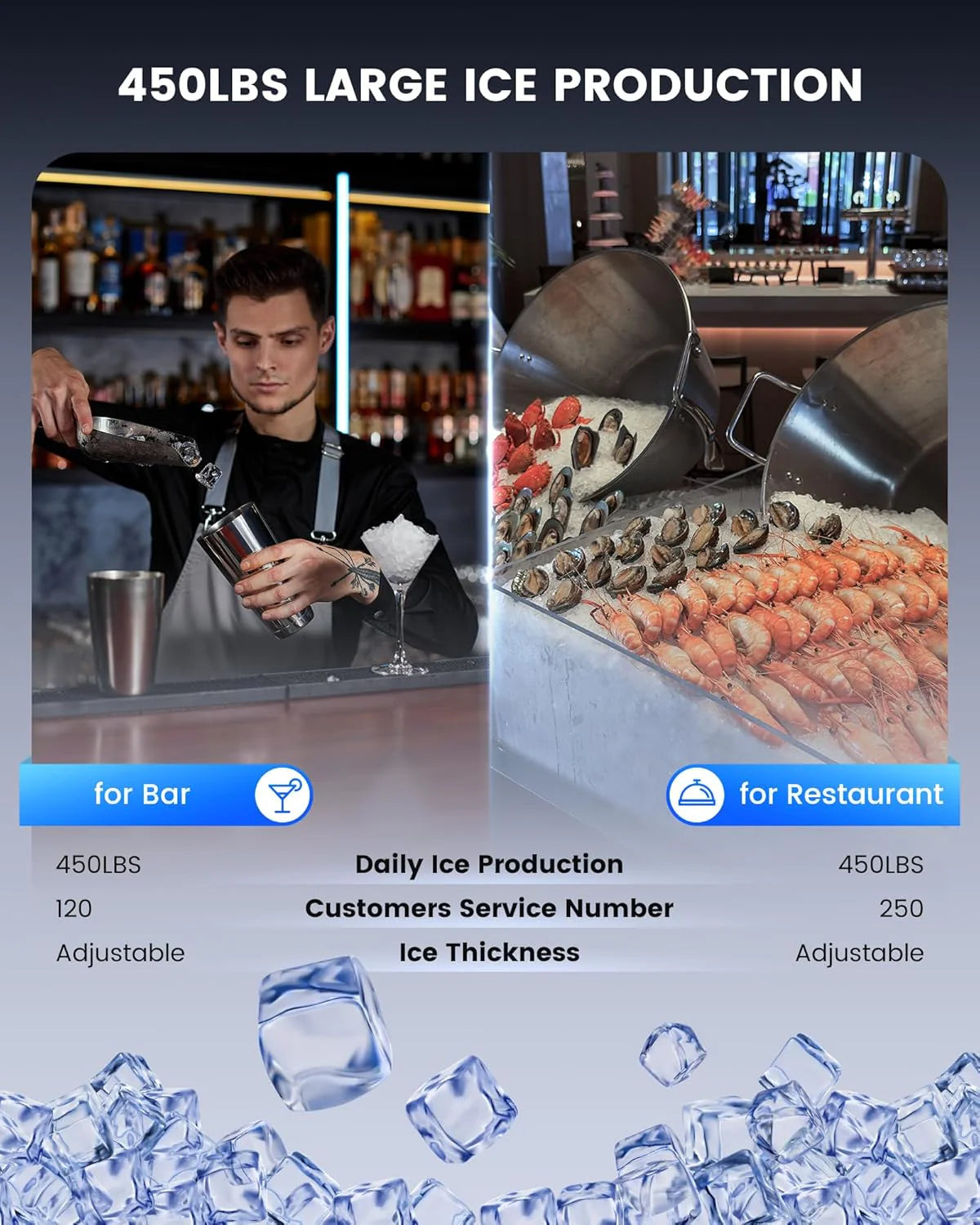 - Two Ice Size Available: Get perfectly chilled drinks with two ice sizes to choose from. Small cubes for chilling seafood and beer, large cubes for beverages. Enjoy refreshing drinks with family and friends