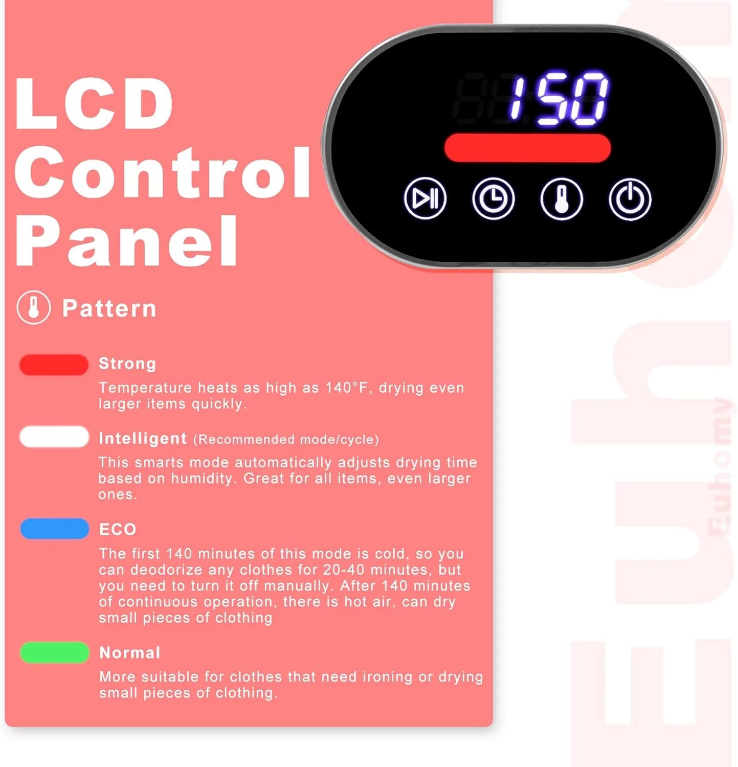 - 【Multi-function】 Our electric clothes dryer machine features a liquid crystal display (LCD) and has four drying modes: 1.Strong: drying even larger items quickly. 2.Intelligent: This smarts mode automatically adjusts drying time based on humidity. Great for all items, even larger ones. 3.ECO: Deodorize any clothes ,dry small pieces of clothing 4.normal: More suitable for clothes that need ironing or drying small pieces of clothing.