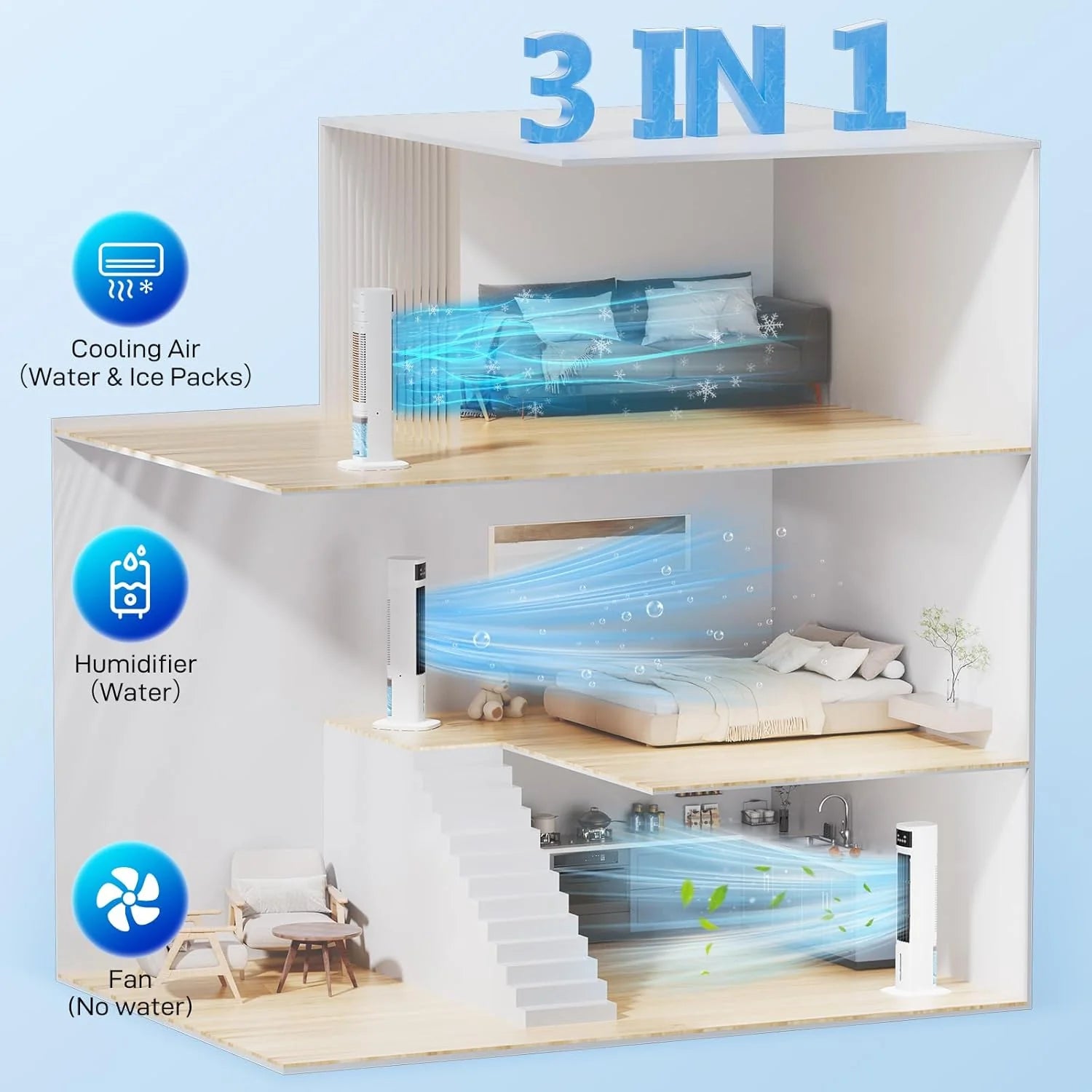 Evaporative Air Cooler, 3-in-1 Portable Air Conditioners for Room, 4 Modes 3 Speeds, Fast Cooling Portable AC Unit w/24H Timer, Remote Oscillating Tower Fan, Quiet Swamp Cooler for Bedroom Office