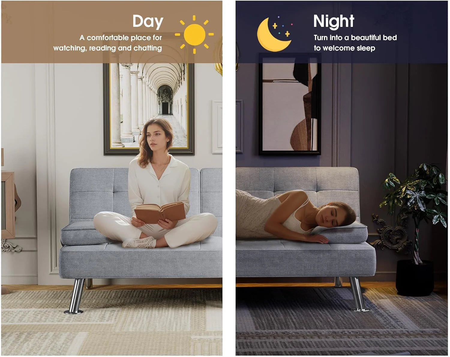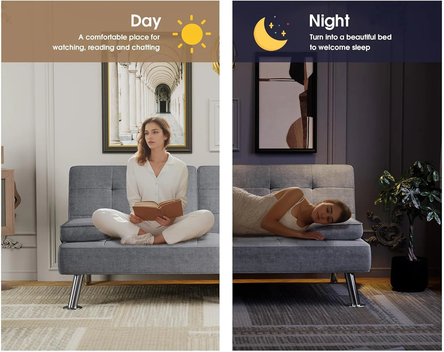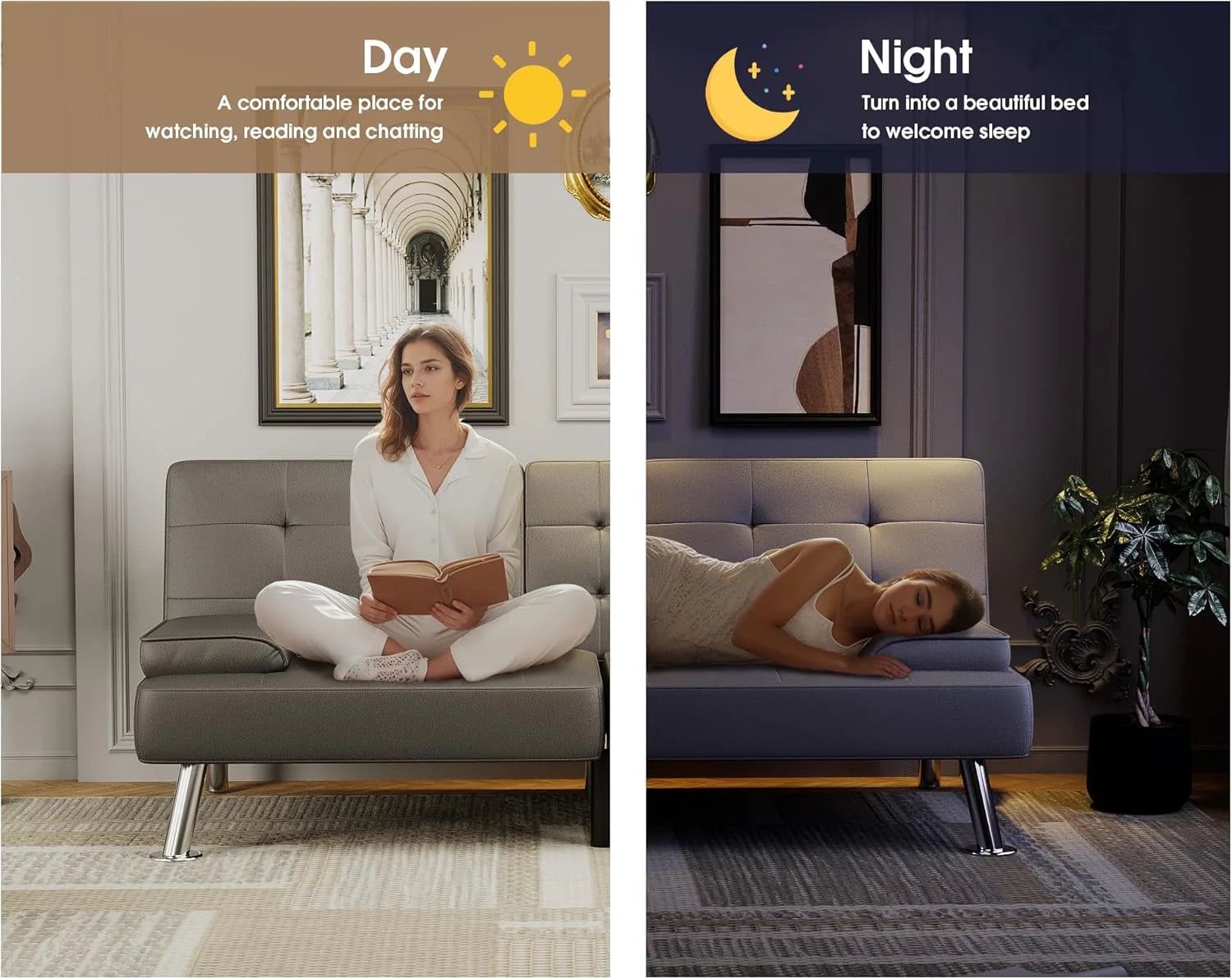 - Cozy Time: The futon couch is filled with high-resilient sponges, soft and supportive, covered by selected material, delivering relax and comfort experience just right. The 2 removable cup holders bring much convenient to get a drink when sitting in the sofa