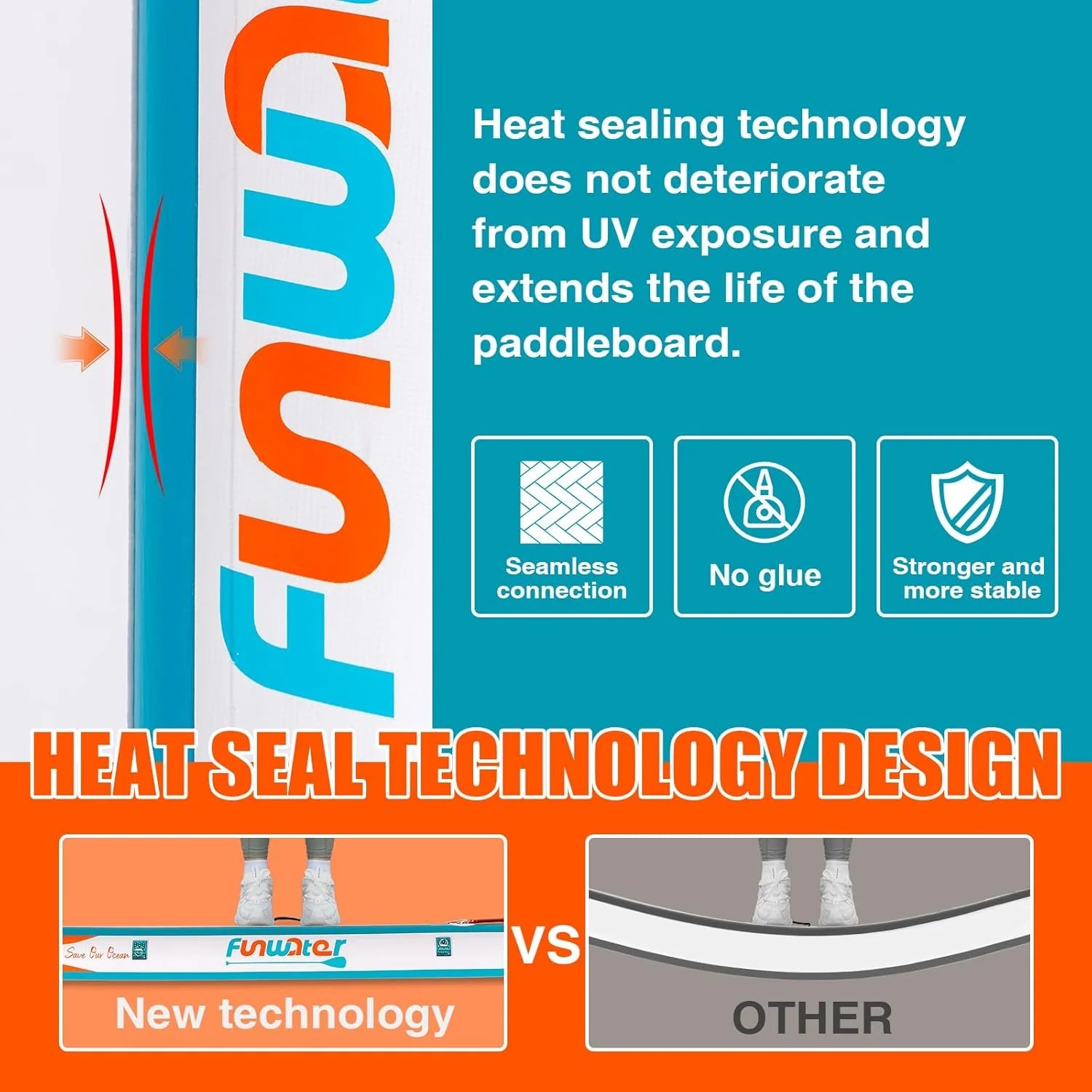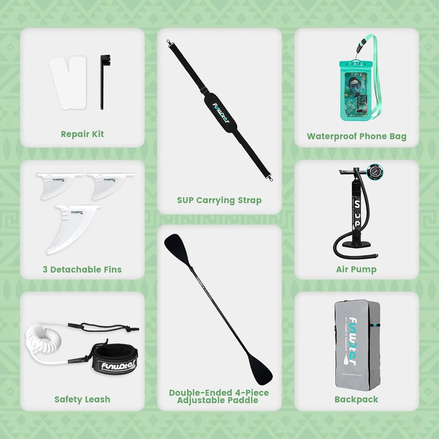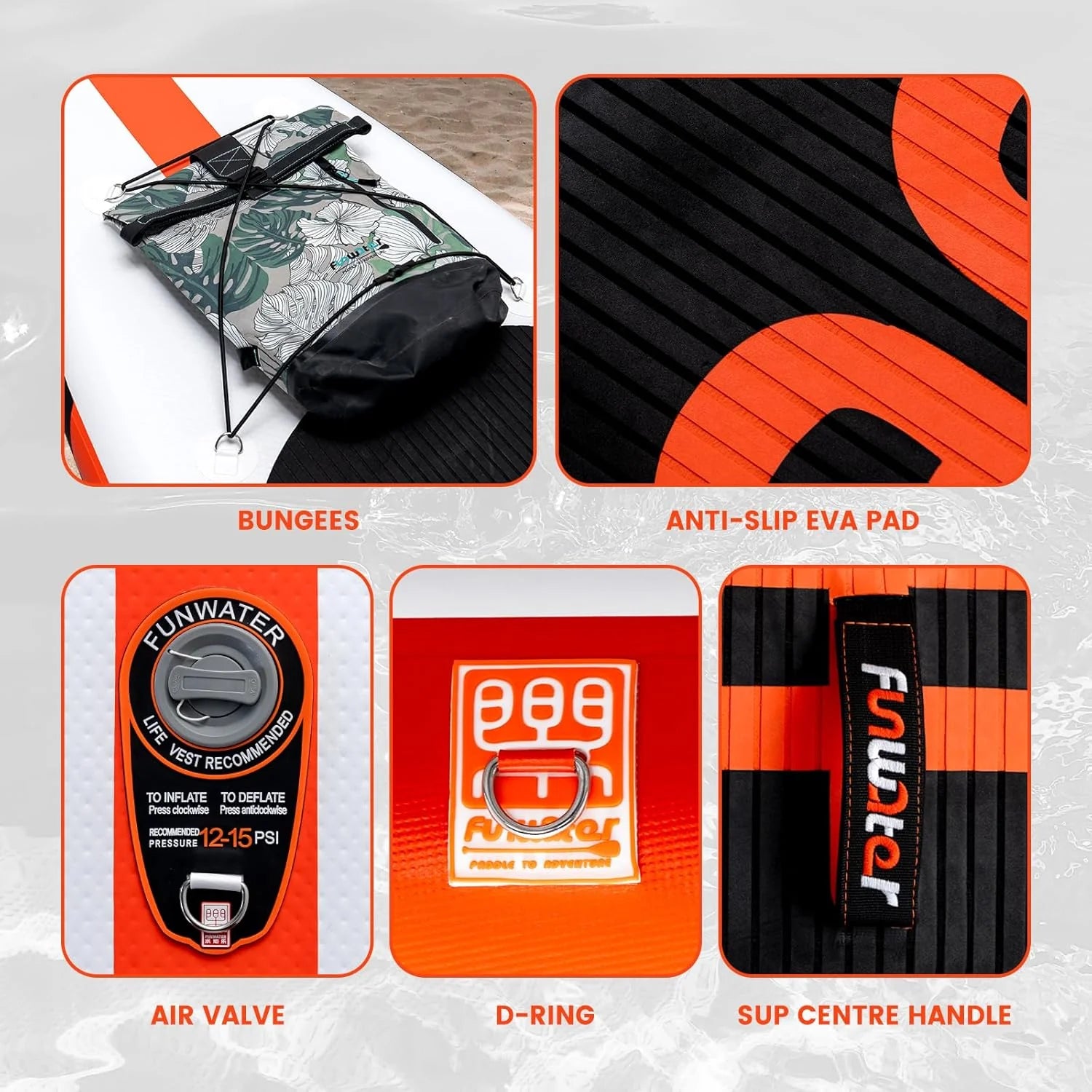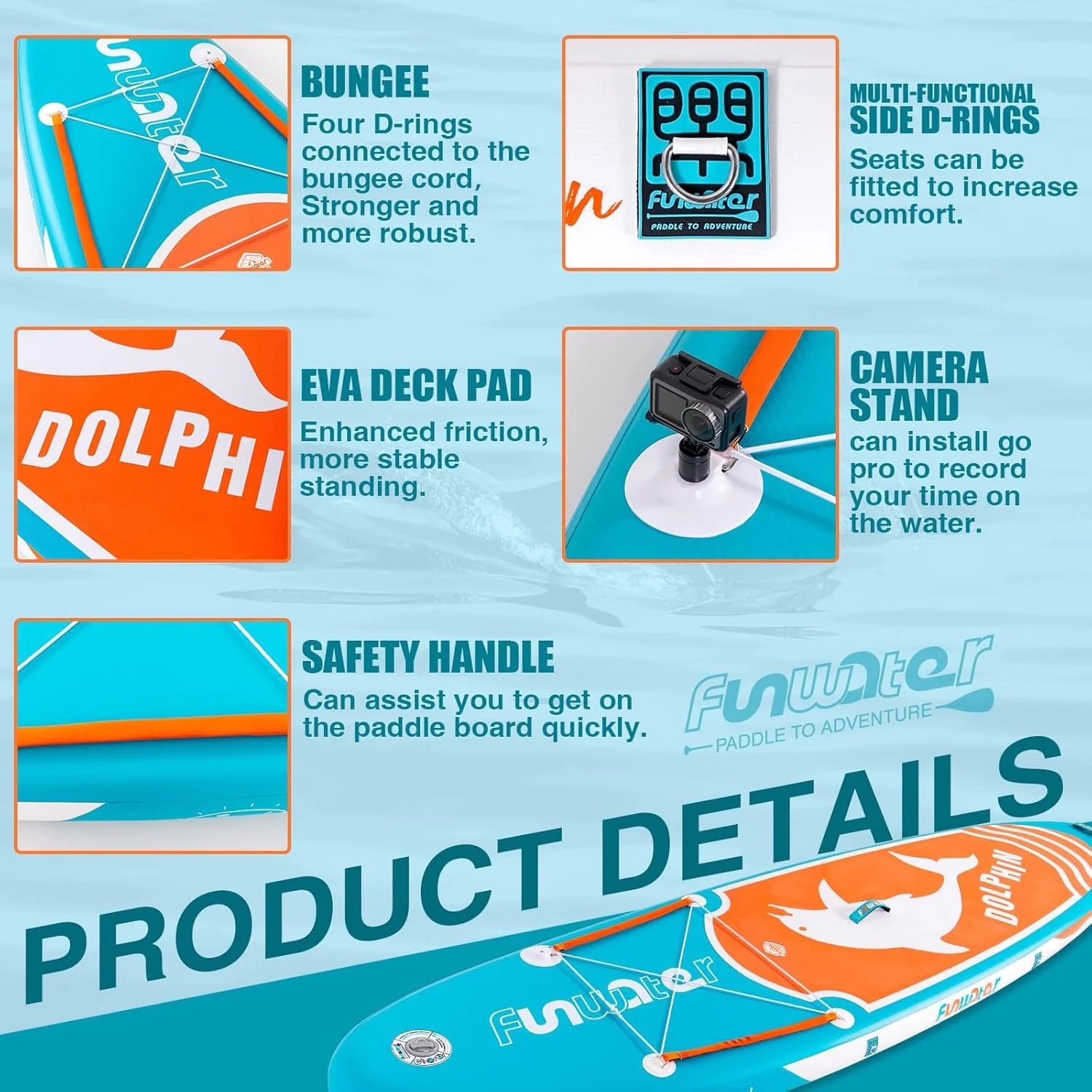 - From the design to the production process, FunWater ensures that every detail of the SUP meets high standards. Features non-slip EVA decking for excellent durability, slip resistance and comfort. The paddle board can be easily inflated and rolled up for easy storage and transport. You can bring along your children and pets, making it perfect for various activities such as yoga, fishing, and sunbathing.