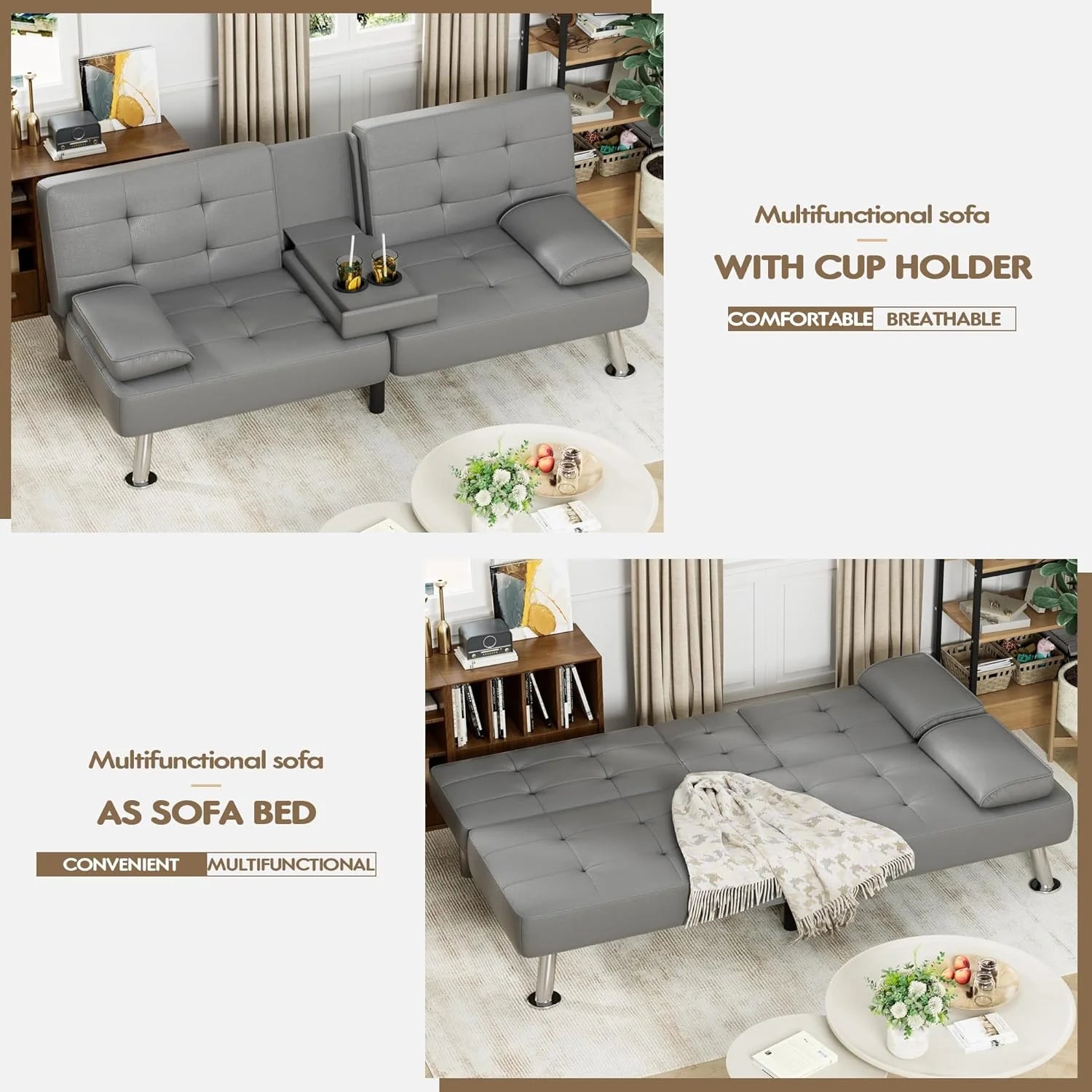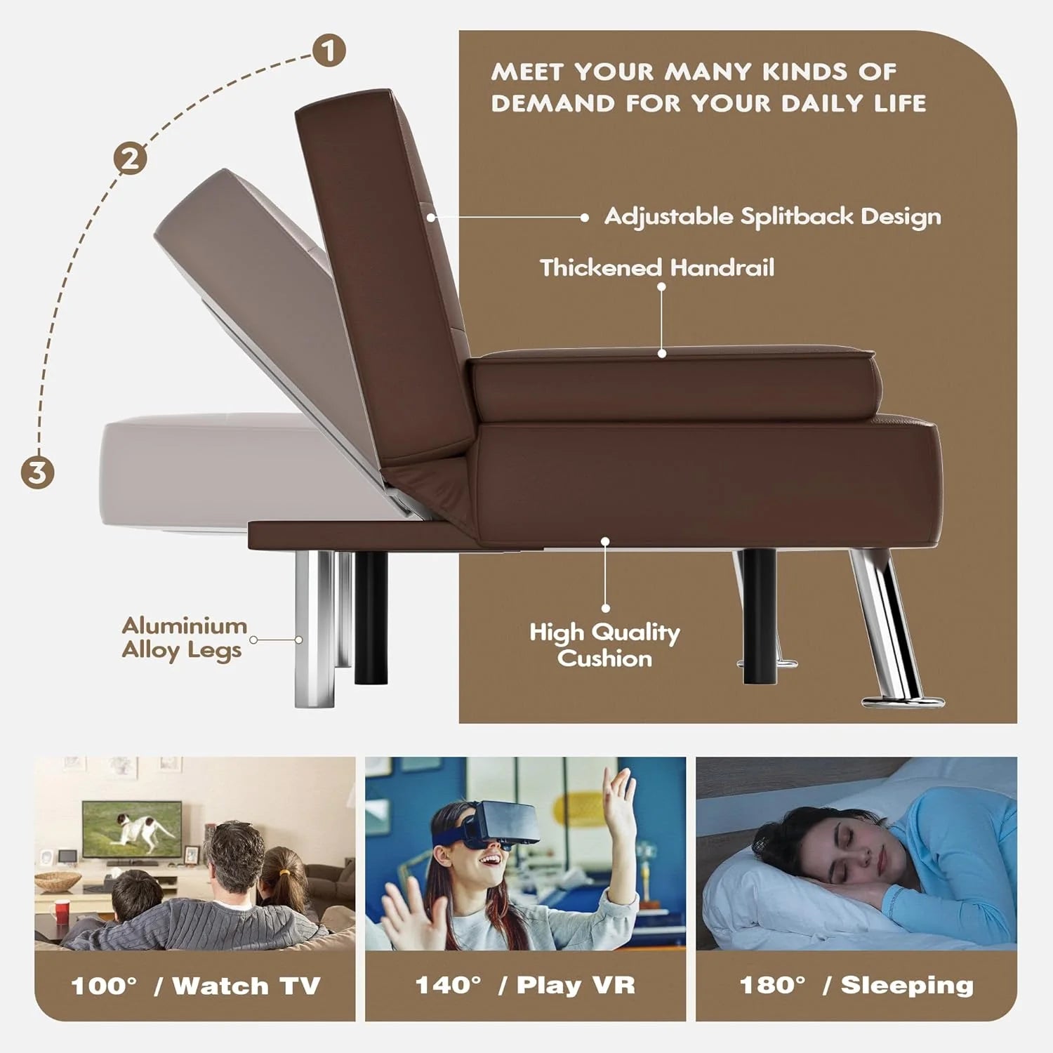 - [Dual cup holders]: The leather futon sofa is conveniently positioned cup holders ensure that your drink is within easy reach, perfect for leisurely enjoying your favorite beverage. It can also be hidden away when not in use, keeping the sofa neat and beautiful.