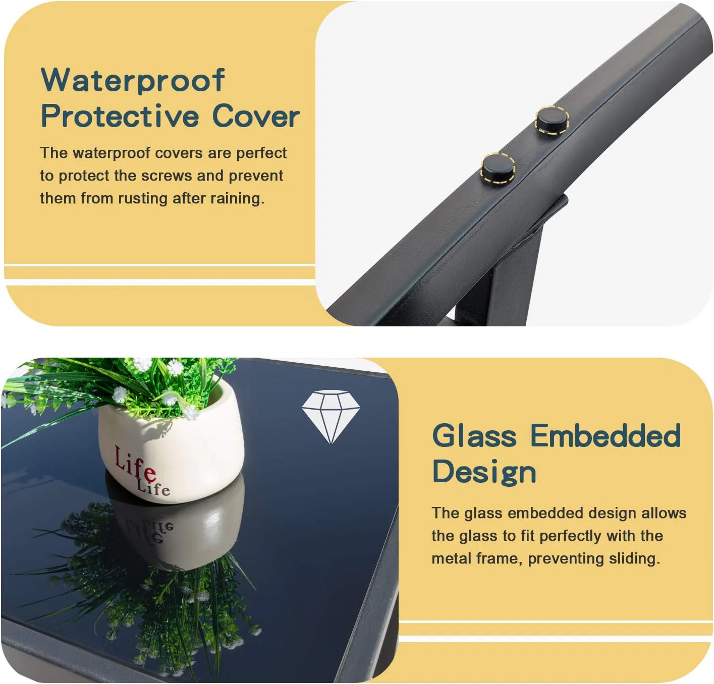 - Powder-Coated Steel: This outdoor dining set are made of high-strength steel and double-layer construction to ensure stability and weighing capacity. The steel is wrapped by a special powder coating that features excellent weather and corrosion resistance. Premium materials ensure that this furniture set will last for a long time