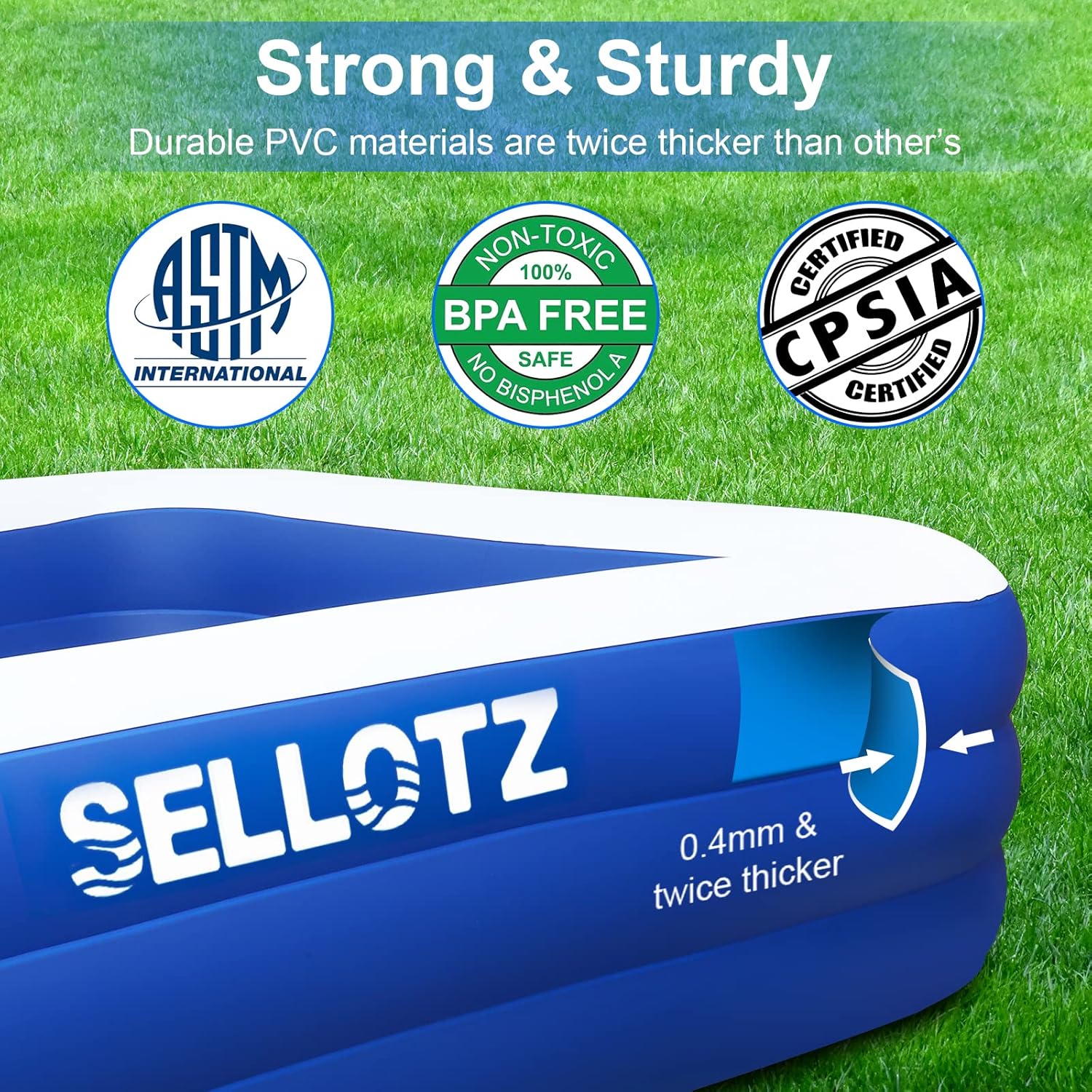 - 【Safe & Durable Retangular Inflatable Pool】: SELLOTZ swimming pool for kids is made with Phthalate and lead free, Using BPA-free materials that meets the standards of international children’s toys, which is twice thicker than most in the market, reducing the risk of punctures and ensuring a long service life.