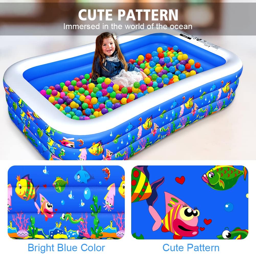 - DURABLE&STURDY MATERIALS: 3 individual air chamber can withstand extra weight while preventing air leakage. Made with 0.4mm thickness PVC material that is 50% thicker than most brands. And it's thick and super soft bottomed inflated floor, avoiding the rapid drop in water temperature, and prevents the kids from falling and get hurt while swimming or playing in the pool.