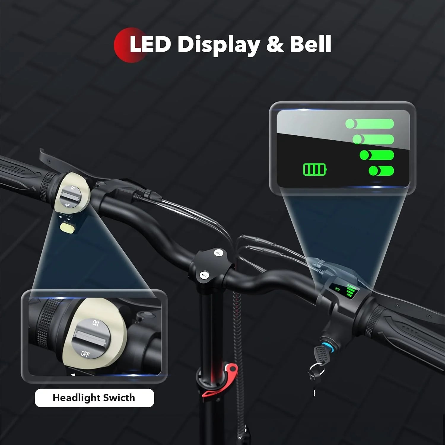 - 【Safe to Ride】The electric scooter for adults boasts an electric lock, warning taillights, and ultra-bright headlights for enhanced visibility during night rides. The dual disc brake system provides excellent stability and control to ensure safe riding, its perfect for city commuting, campus travel, and office commutes. It is certified to UL2272