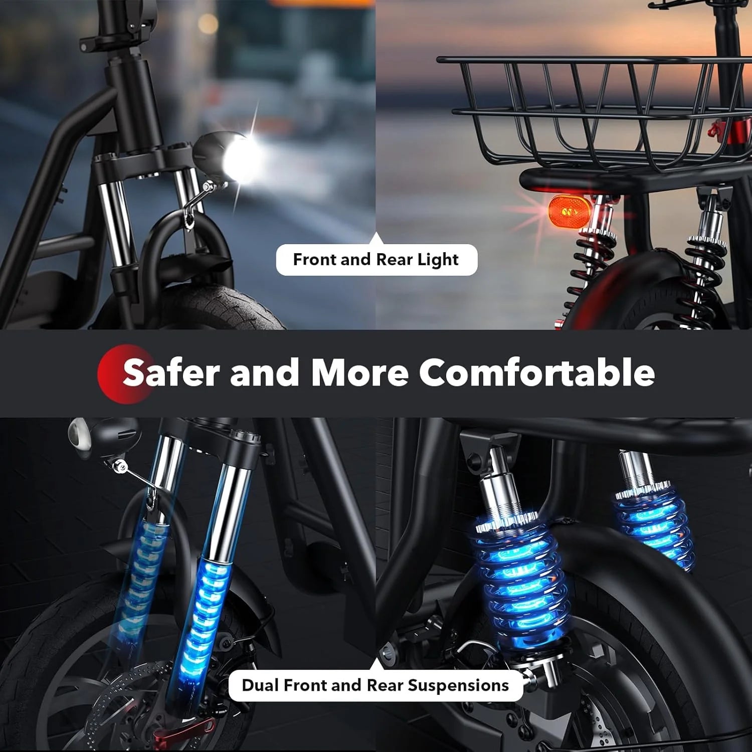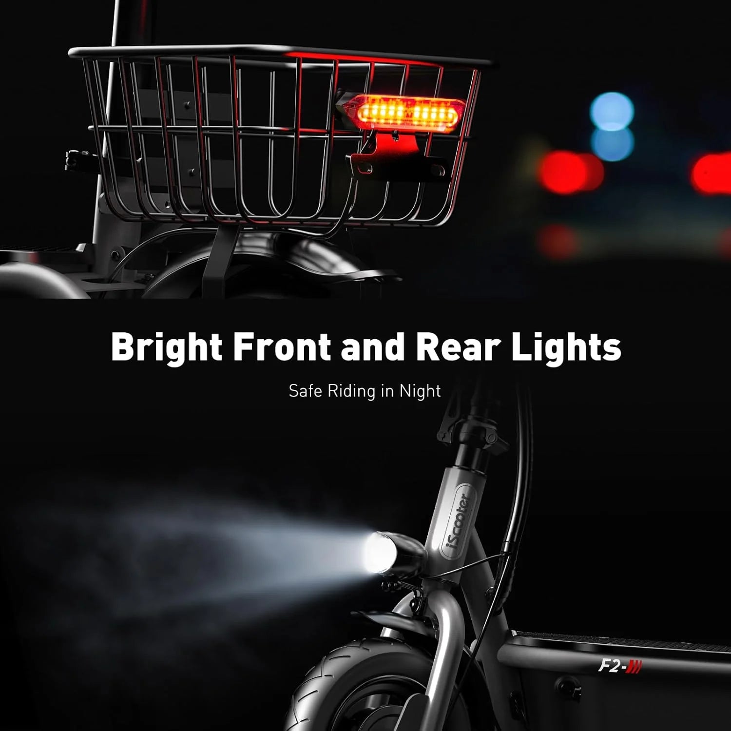iScooter electric scooter with seat, 37/21 mile range, 28/19/15.6 mph top speed, dual suspension scooter with basket