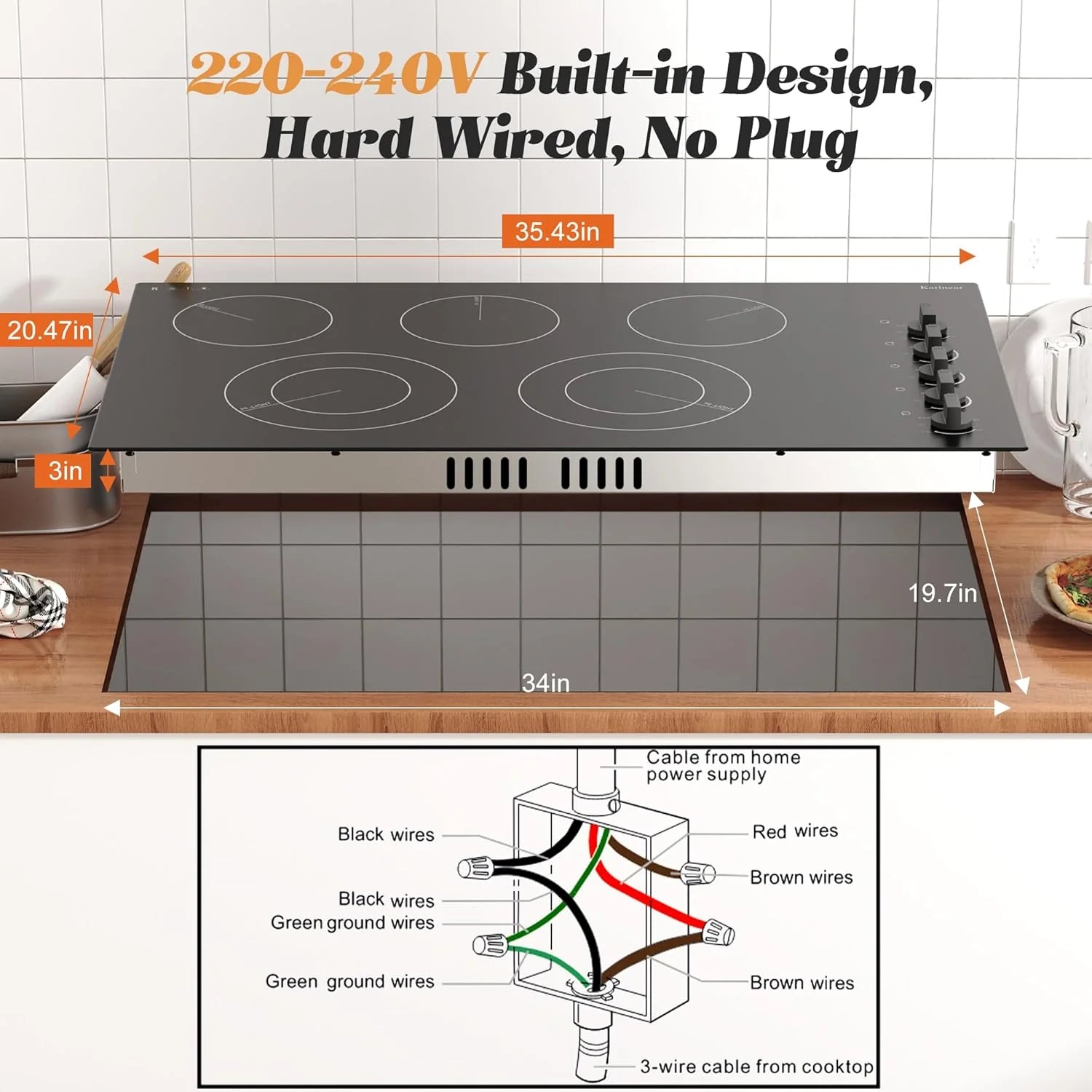 - 【9 Power Setting & 220v-240v Electric Cooktop】The 30" ceramic cooktop equipped with 4 powerful burners:1200W+1200W+1800W+1250/2500W(Dual). Every burner of the drop-in electric cooktop has 9 power levels, rotating the Knob to contrtol the power from 0-9 levels, perfect for braise, fry, deep fry, stir-fry, roast, and more.Built-in electric cooktop requires professional wiring to 220-240V, NO plug.