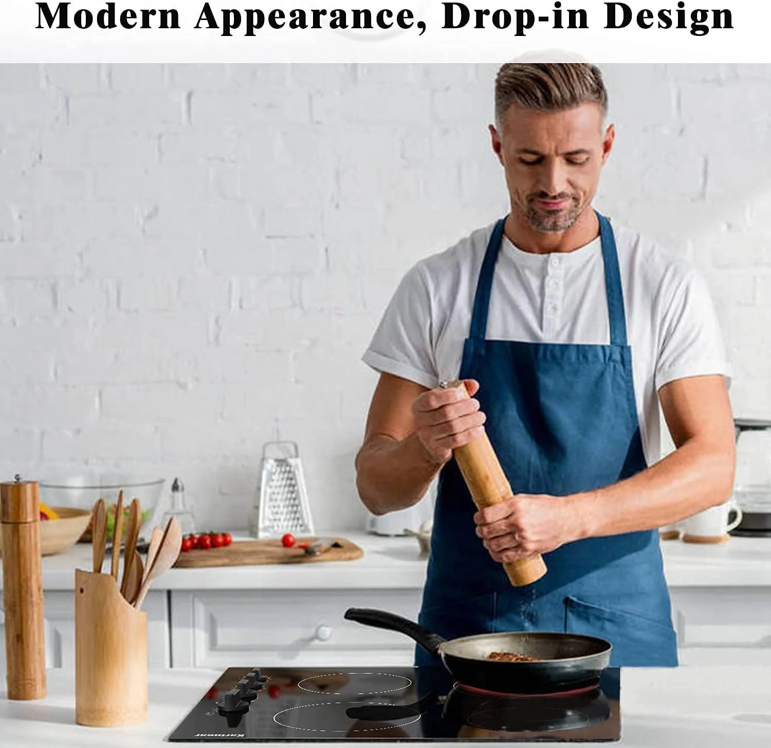 - 【Electric Cooktop 4 Burners with Knob Control 】No complicated buttons, easy to operate and use. This kind of knob-conrtol electric cooktop is very suitable for the elderly, suitable for people with poor eyesight. Many elderly people don't know how to use other sensor touch cooktop, and their eyesight can't see the small buttons. So they need a knob type electric stovetop more, which is more convenient for them to operate.