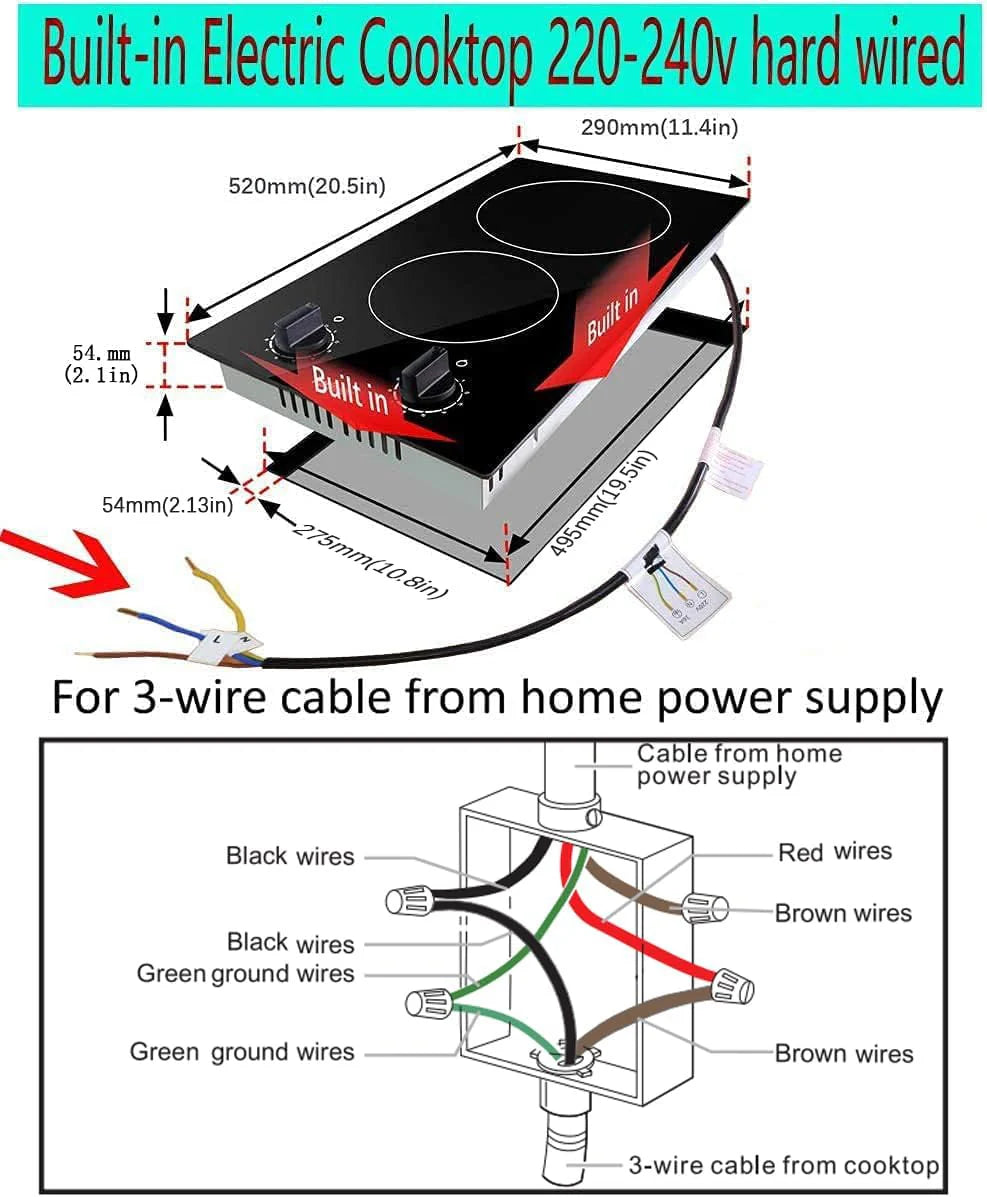 The 220v- 240v electric cooktop has no plug and require professional wiring. Wiring is simple, see our wiring diagram. If the glass is broken or there is any problem, please tell the seller in time to help you solve it.