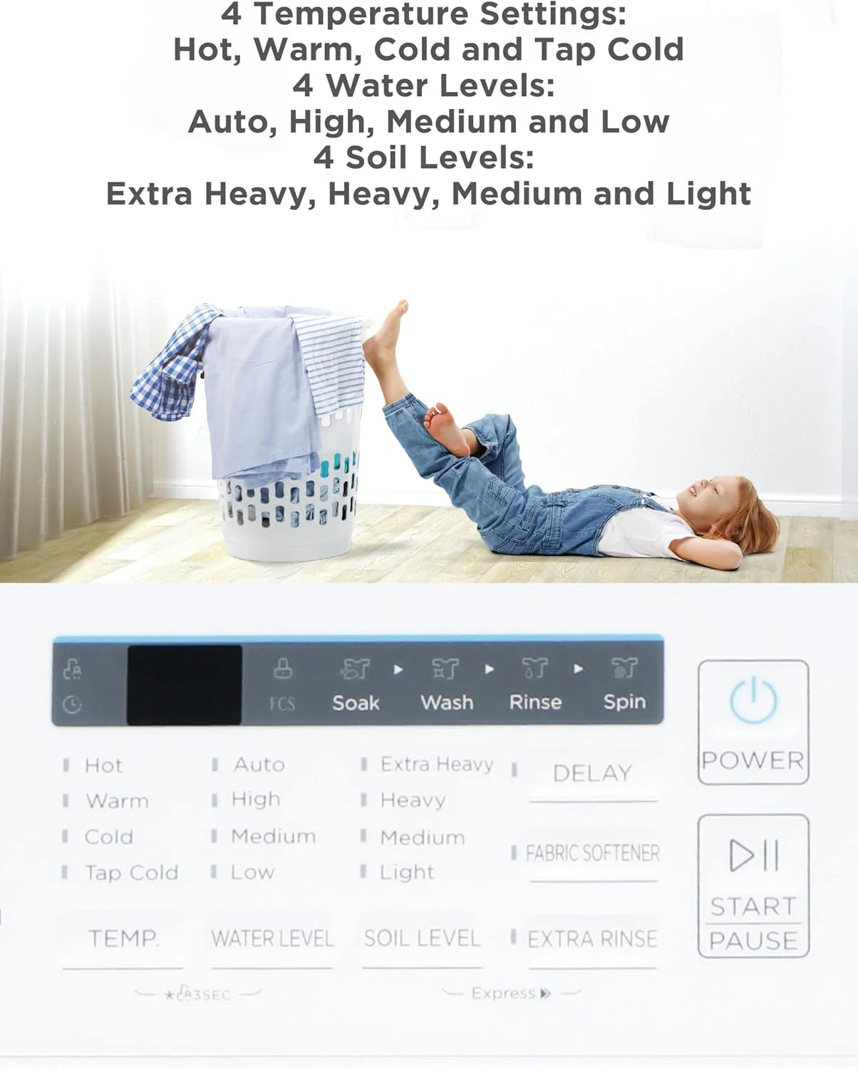 - Safety Features: Our small washing machine features auto unbalance detection to ensure laundry is cleaned at peak performance, as well as auto shutoff safety features and child lock protection.