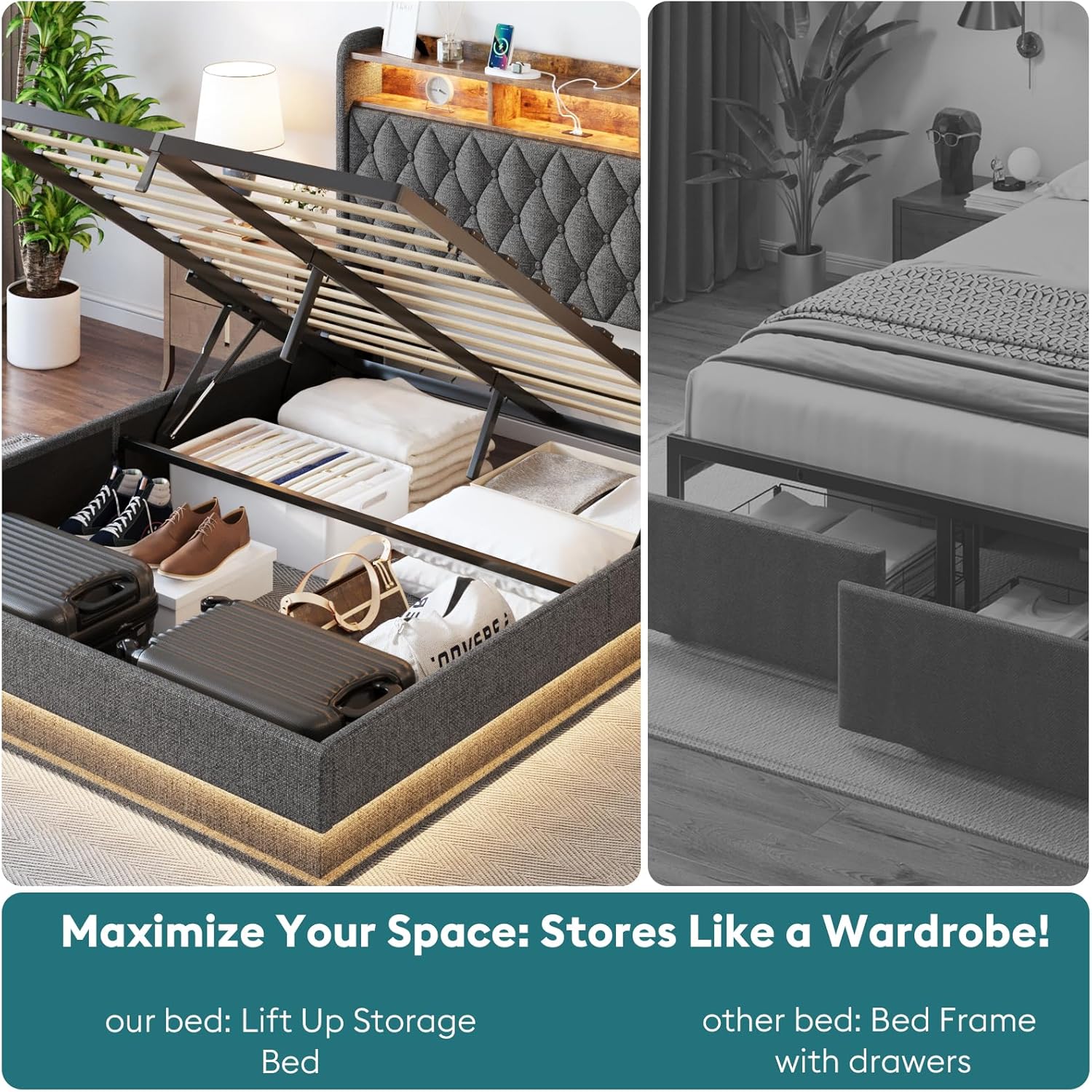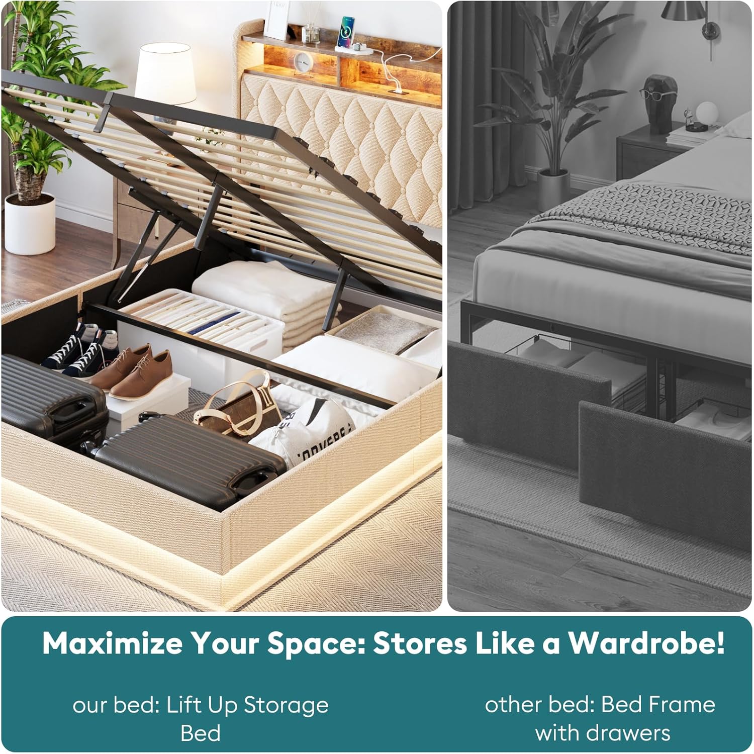 Queen Bed Frame with Storage - Lift Up Queen Size Bed Frame with Headboard, Upholstered Platform Bed with LED Lights & Charging Station, Hydraulic No Box Spring Needed Wood Slats Support, Beige