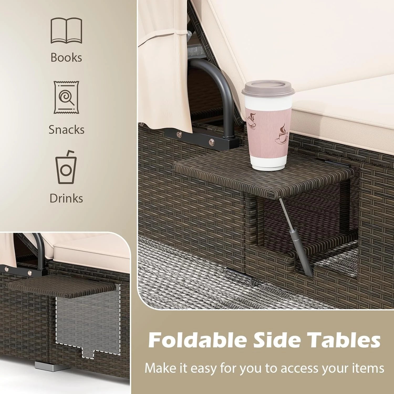 - [Retractable Canopy & Side Tables]: The retractable canopy is designed with reliable gas struts for smooth and effortless opening and closing. Meanwhile, equipped with 2 folding side trays, this outdoor bed lounger keeps snacks, drink, phones, sunglasses within easy reach, enhancing your relaxation time with optimal convenience.