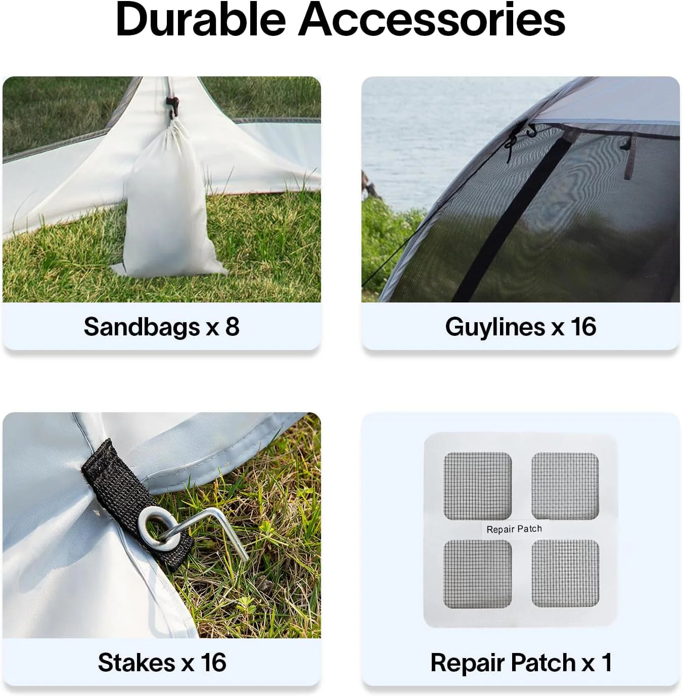 Extra PE Floor ASIN B07P2D24N6 (10'x10') to keep clean. Extra sun shade sails B085G3379N, protect you from the burning sun & protect privacy.