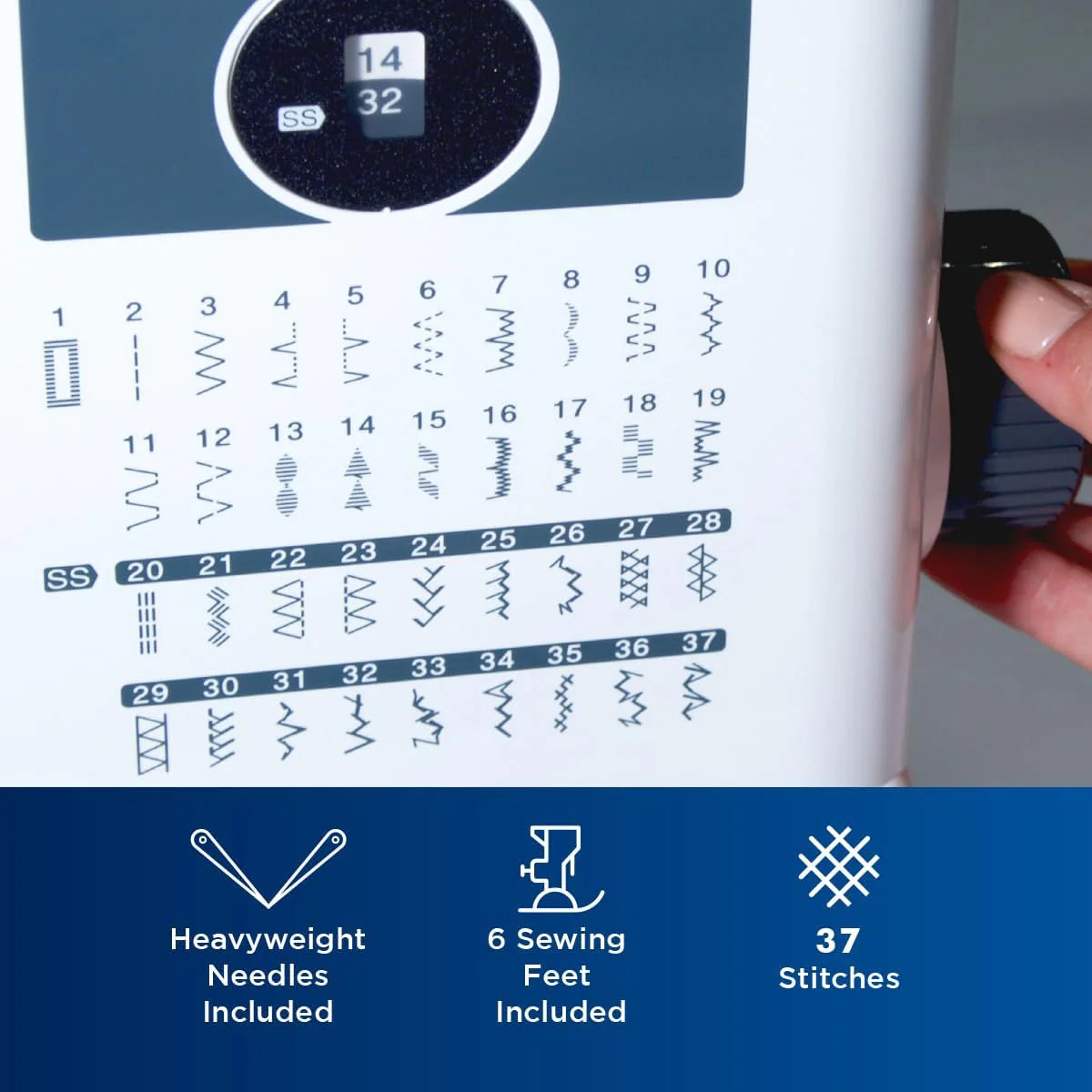 Features 37 stitches including stretch, zigzag, decorative and an auto-size buttonhole