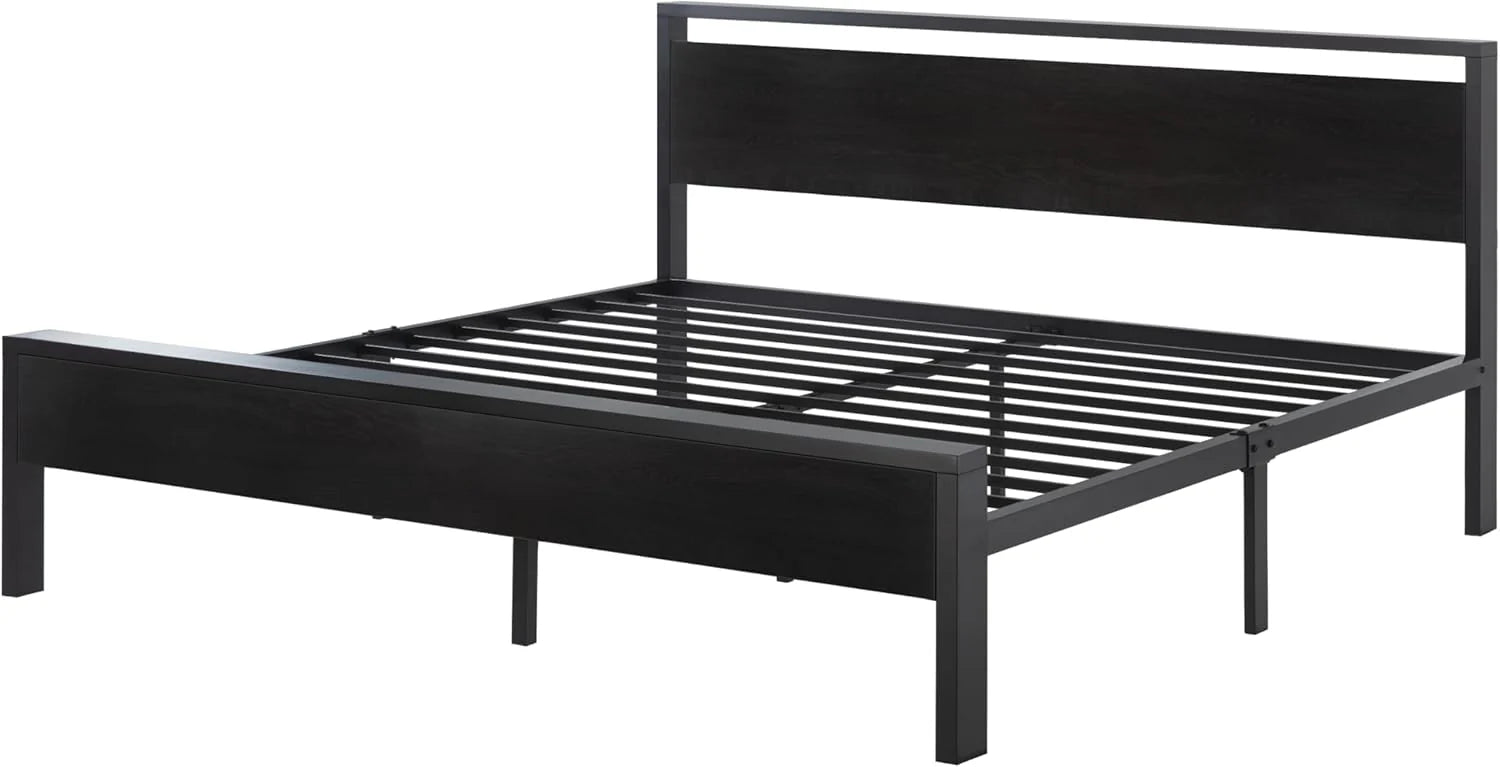 SHA CERLIN 14 Inch Queen Size Metal Platform Bed Frame with Wooden Headboard and Footboard, Mattress Foundation, No Box Spring Needed, Large Under Bed Storage, Non-Slip Without Noise, Black Oak