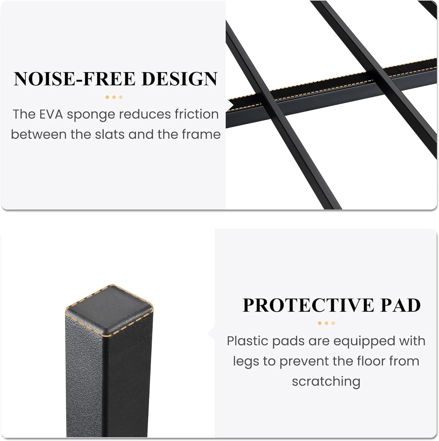 - Noise Free: The non-slip strips hold the slats in place, and plastic foot plugs added to the bottom of the bed feet will never scratch your beloved floor