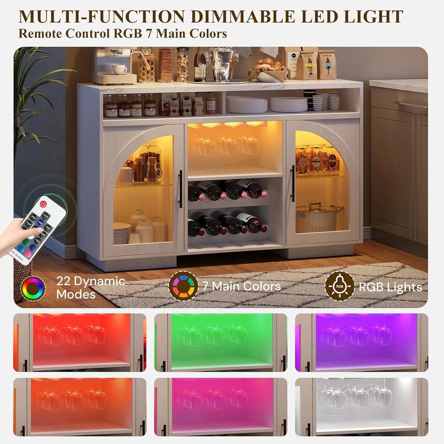Sideboard, 54-inch kitchen cabinet with LED lights and arched glass doors, tall bar cabinet