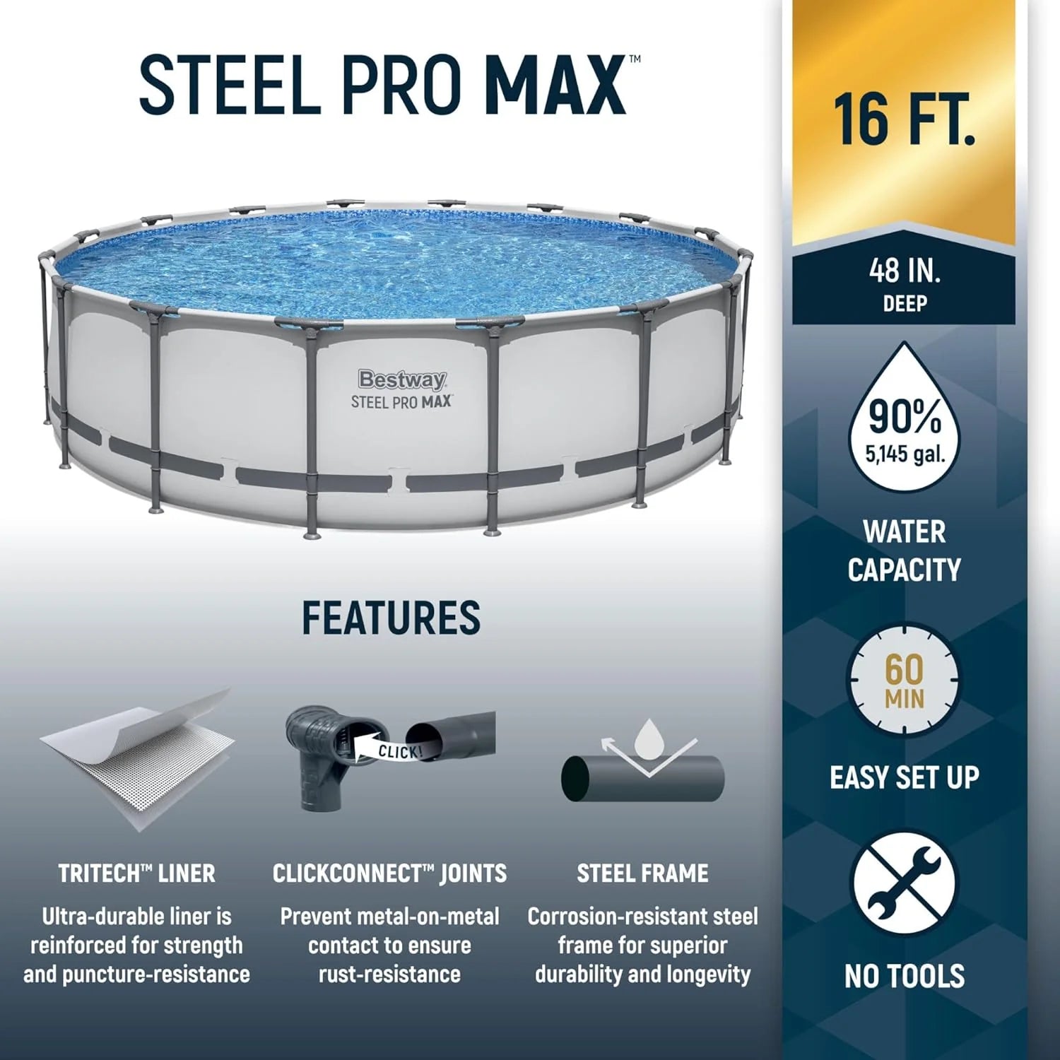 Steel Pro MAX 14 Foot x 48 Inch Round Metal Frame Above Ground Outdoor Swimming Pool Set with 1,000 Filter Pump, Ladder, and Cover, Gray
