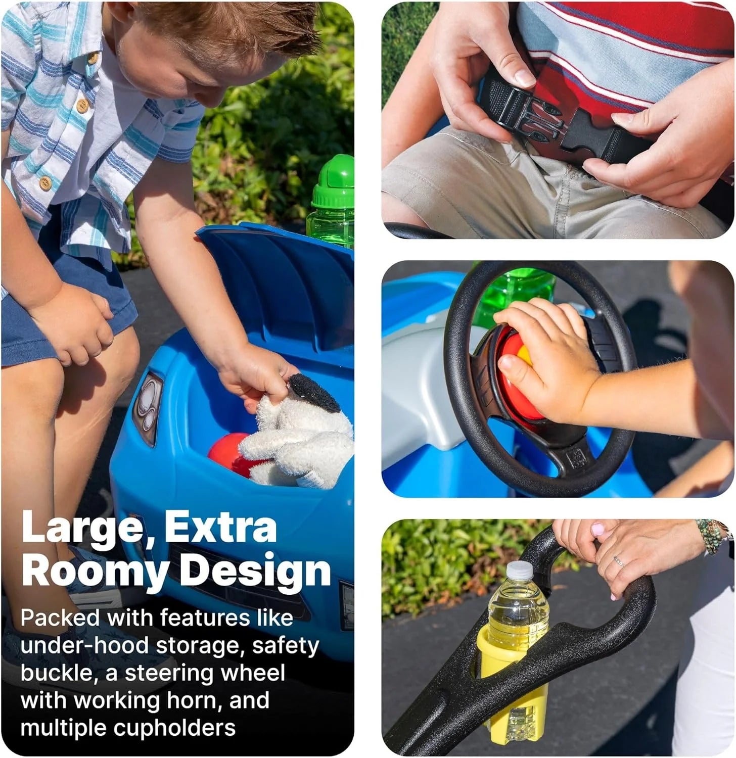 - SAFE & FUN: Easy-latch adjustable seat belt for safety, real car horn and steering wheel, convenient cup holders, under-hood storage for snacks and toys