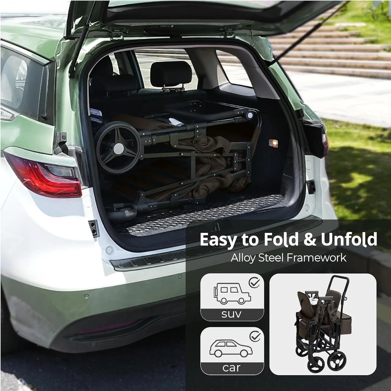 - Easy to Use: Conveniently folds for storage and transport, fitting most car trunks. Includes a one-foot brake lever for safety and an adjustable handle for effortless control.