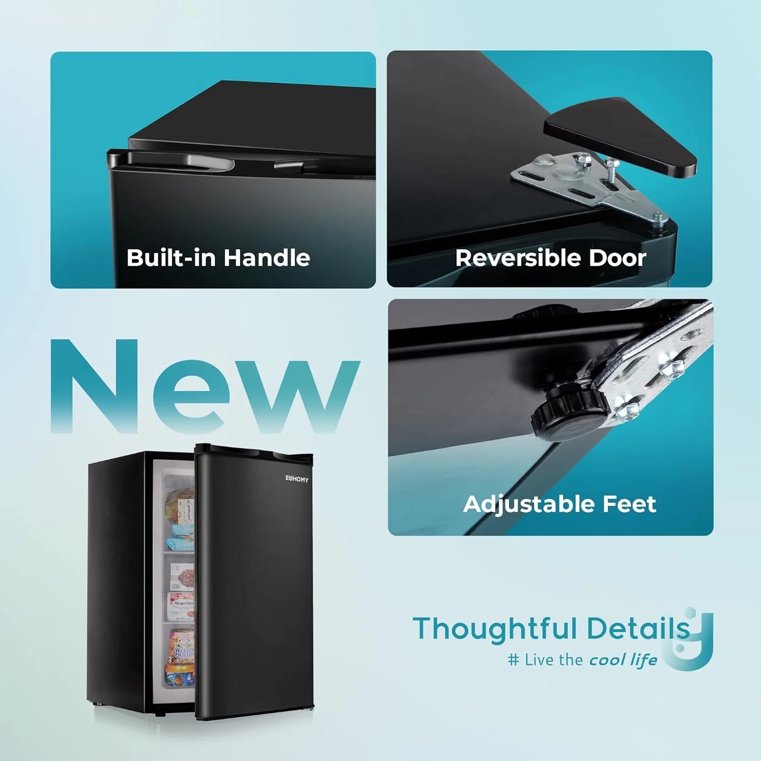 - DETAIL OPTIMIZATION - Euhomy freezer have designed some additional functions that are different from those on the market according to people's habits and needs. REVERSIBLE DOOR: It is easy to change the direction of the door switch. ADJUSTABLE FEET: keep the machine from being corroded by moisture on the ground. BUILT-IN HANDLE: not only easier to open the freezer door, ut also makes the freezer more simple and beautiful