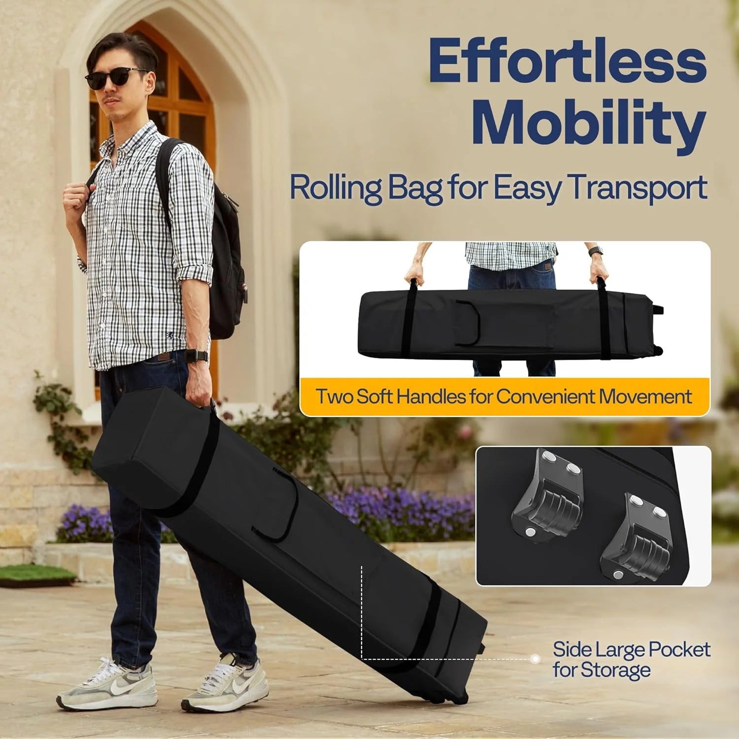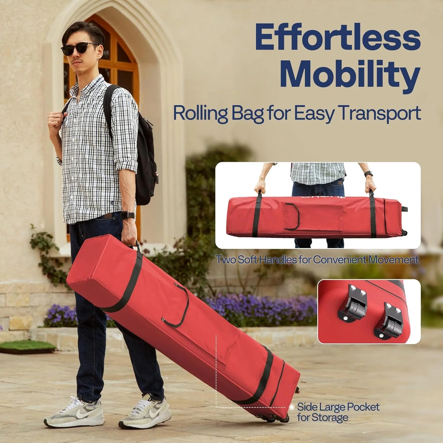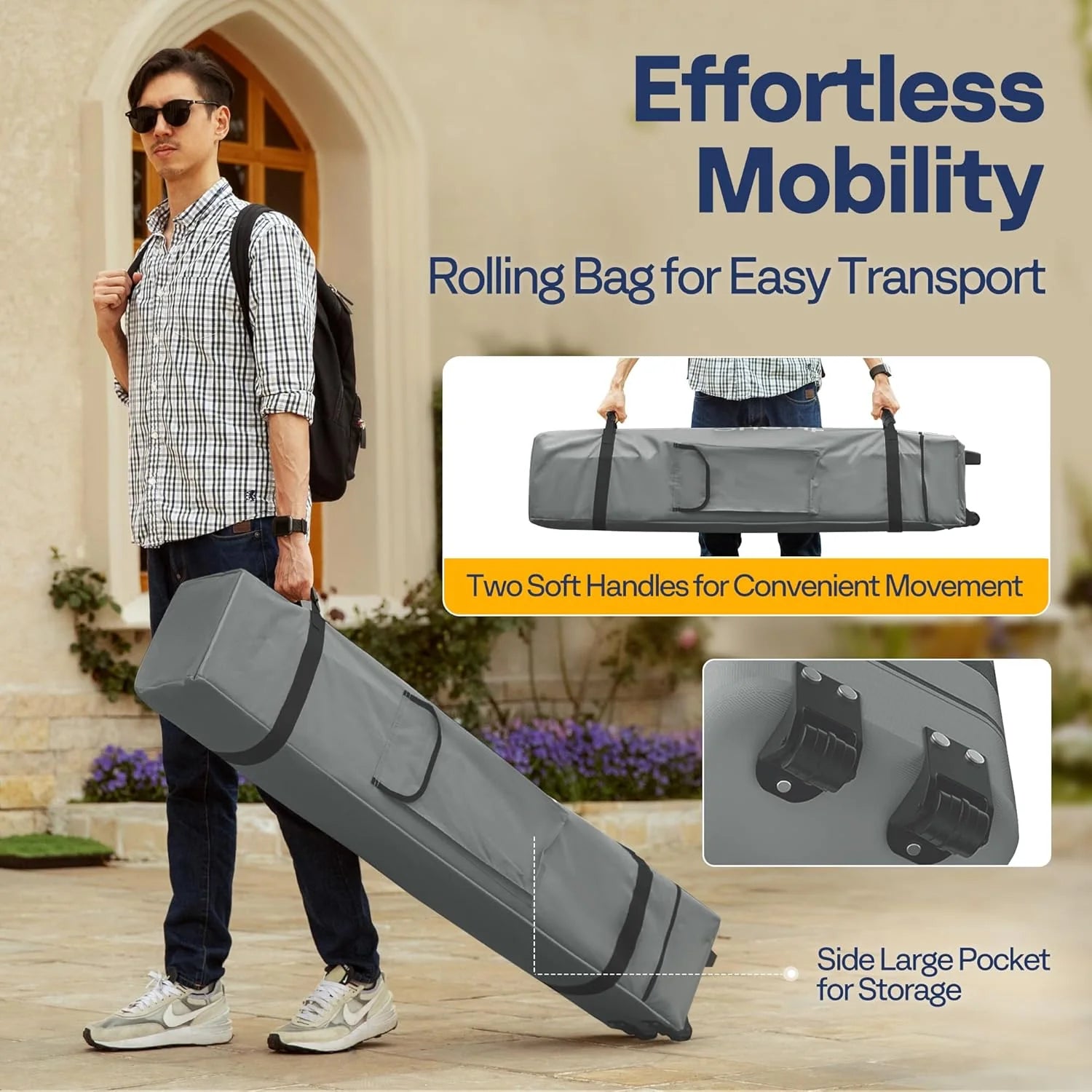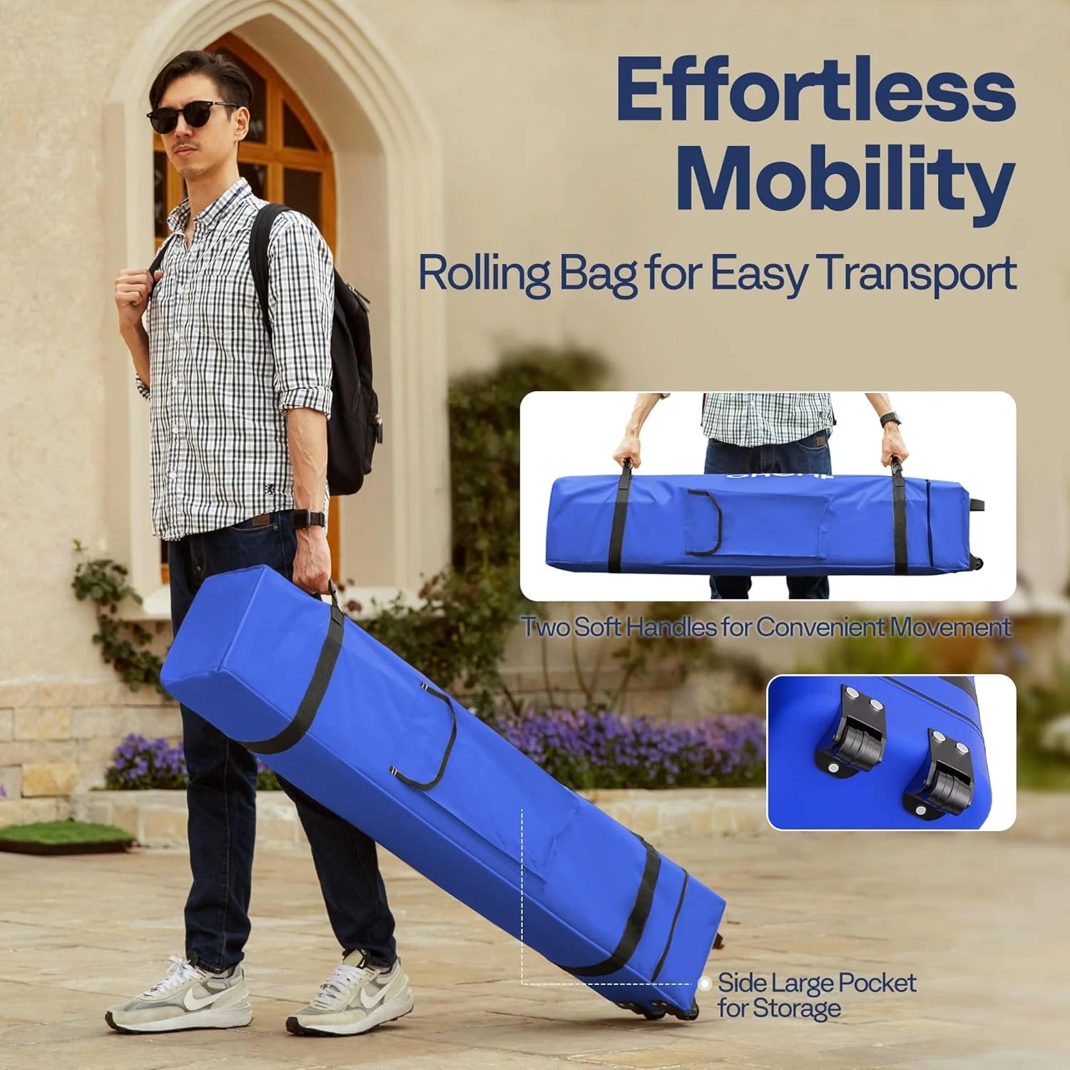 - EASY TRANSPORT - The roller bag, made of 300 x 600D Oxford cloth, comes with 2 casters, 2 robust base feet, and 2 soft handles, which is portable for your on-the-go lifestyle; Designed with practicality in mind, the storage bag features a large pocket on the side; Keep ground nails and ropes organized before installation or pack essentials like snacks, drinks, or books for your outdoor leisure; Whether camping, hiking, or beach-bound, this pop-up tent will be your ideal companion